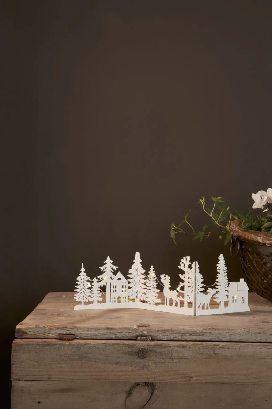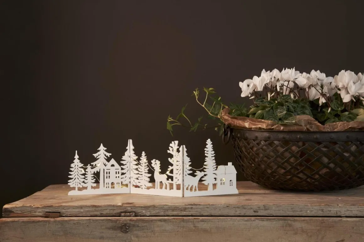 Så vacker laserskuren jul och advent siluett med motiv av träd, hjort och hus. Dekorationen är vikbar. 10 st led punkter lyser i ett varmvitt sken bakom siluetten. Vacker dekoration till jul, advent eller den mörka årstiden. Placera i ett fönstret, på en skänk eller hylla. Drivs med 2 AA batterier. (medföljer ej)