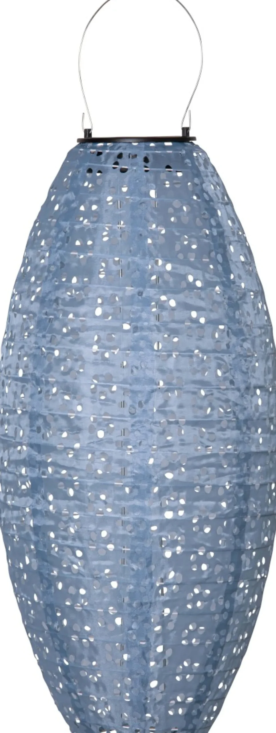 Solcellslyktan Festa är tillverkad av blå polyester med ett hålmönster som skapar ett vackert skuggspel när den lyser i mörkret. Den är en fantastisk dekoration för trädgården, terrassen eller balkongen. Festa finns i två modeller och tre färger, och denna specifika modell har en diameter på cirka 20 cm och nära 40cm i höjd. Placera lyktan så att solen kan nå panelen under dagen för optimal laddning av det medföljande batteriet. En perfekt detalj för att lysa upp din utomhusmiljö!
