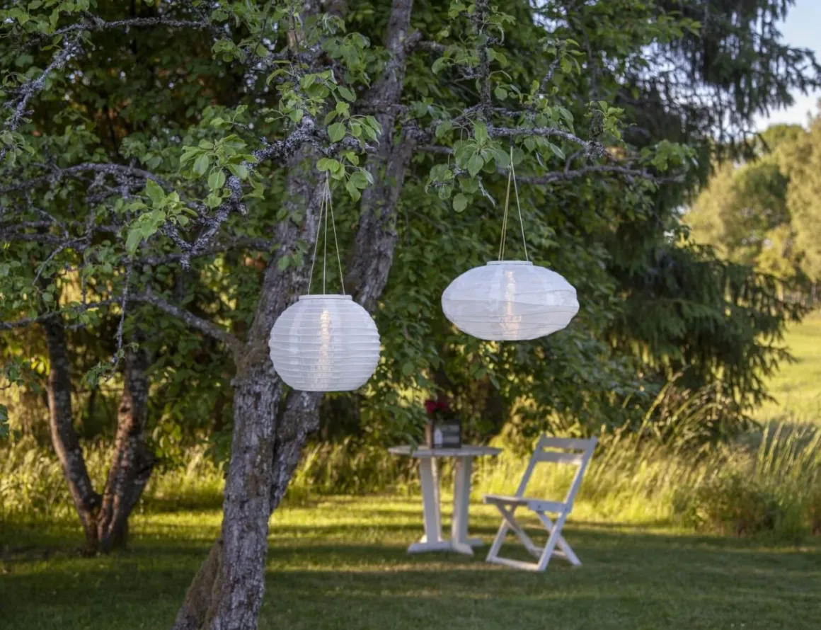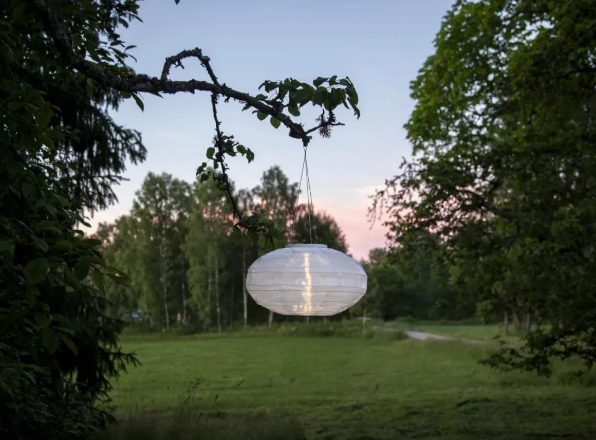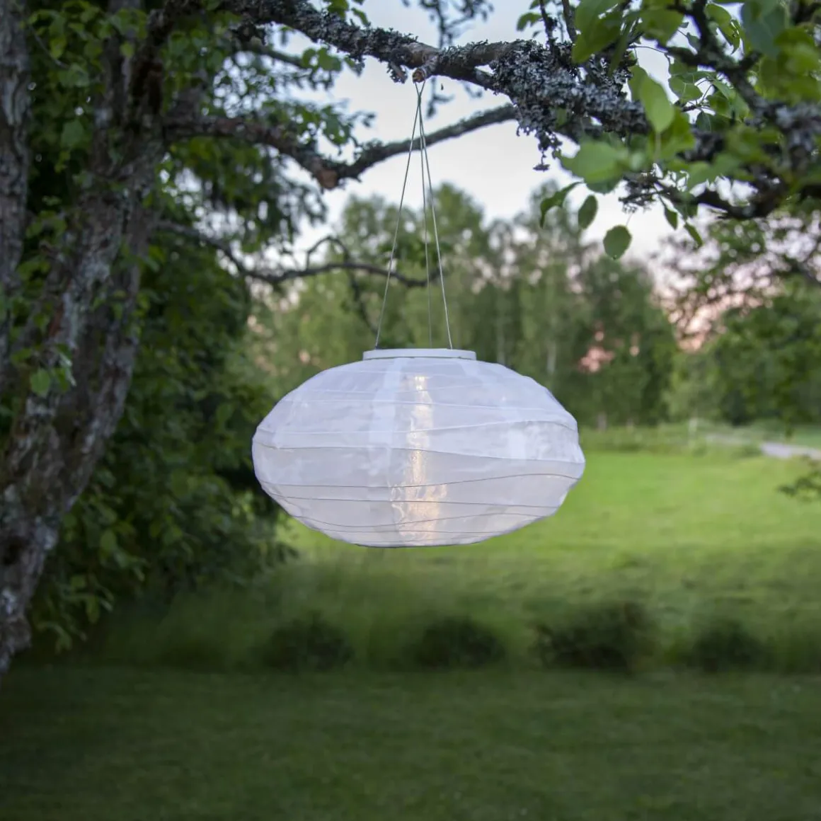 Vit ”risboll” i polyester som drivs med solens varma strålar, tänder per automatik när mörkret kryper på, bollen är 35 centimeter i diameter och cirka 19 centimeter hög.