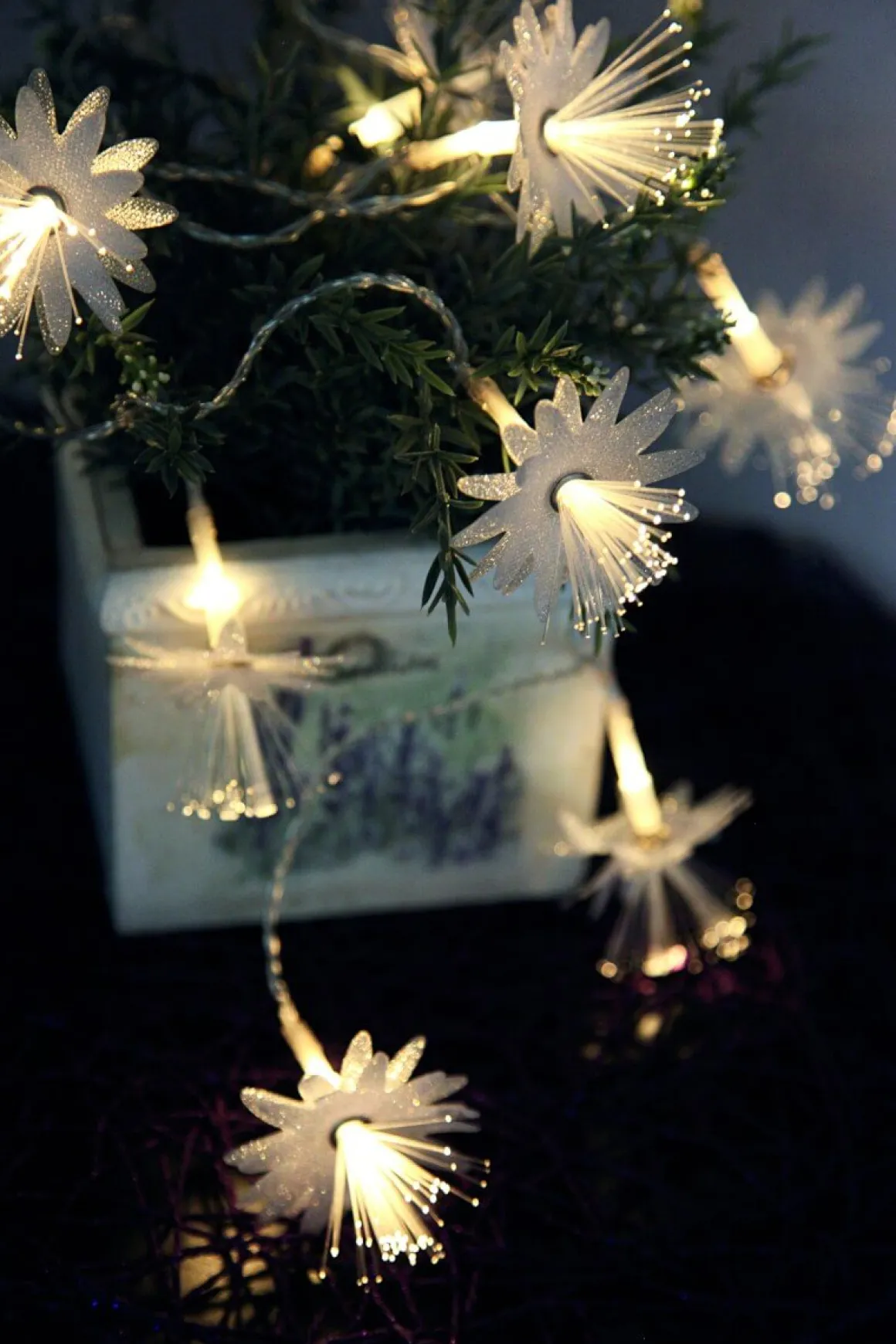 Dekorativ ljusslinga med 10 varmvita LED ljuskällor som alla utgör mitten av en söt liten vit blomma. Batteridriven med timerfunktion.