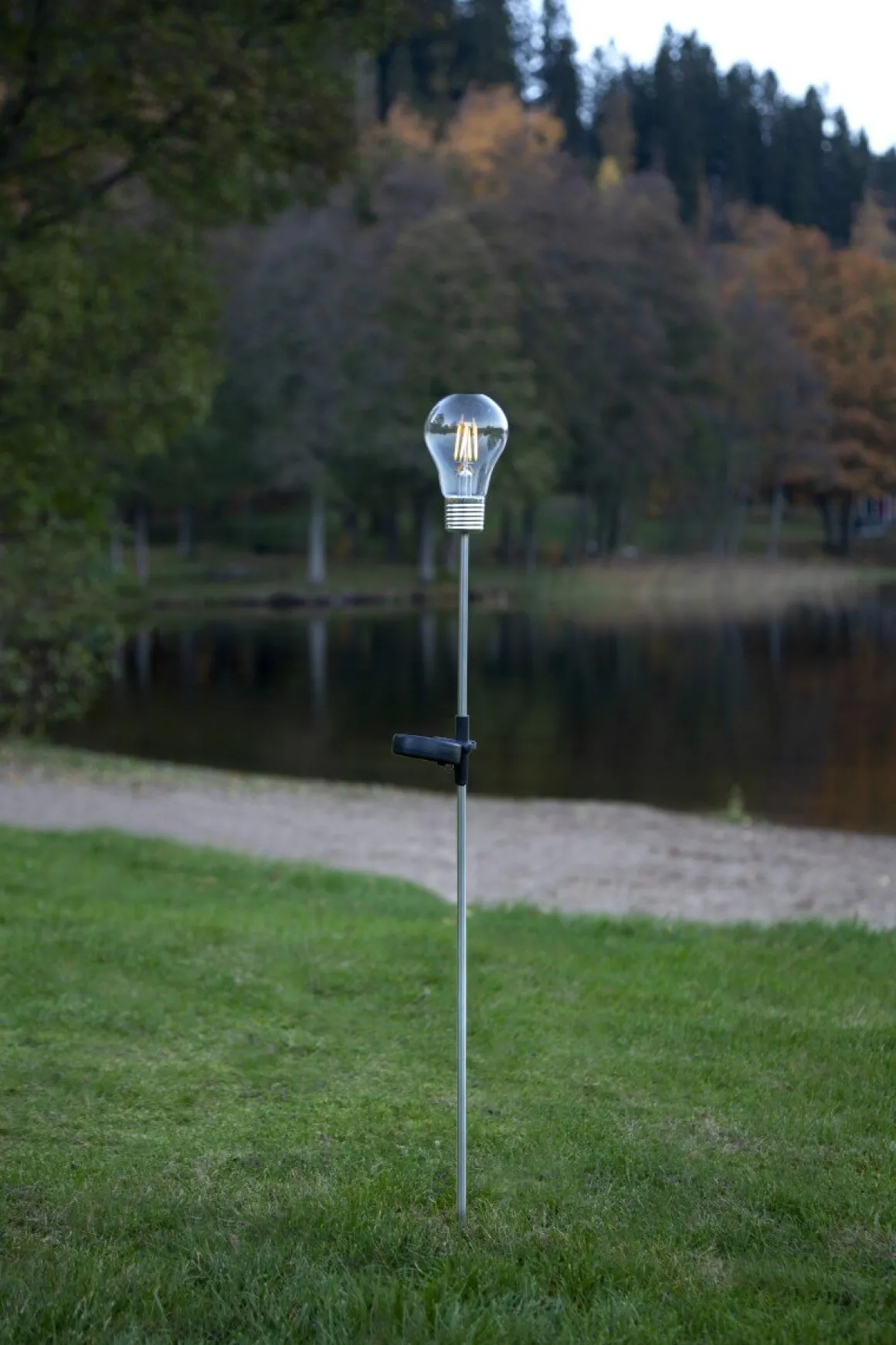 Festlig solcells pinne med en varmvit lysande glödlampa på toppen. Lampan laddas med solen och tänds automatiskt när mörkret faller.