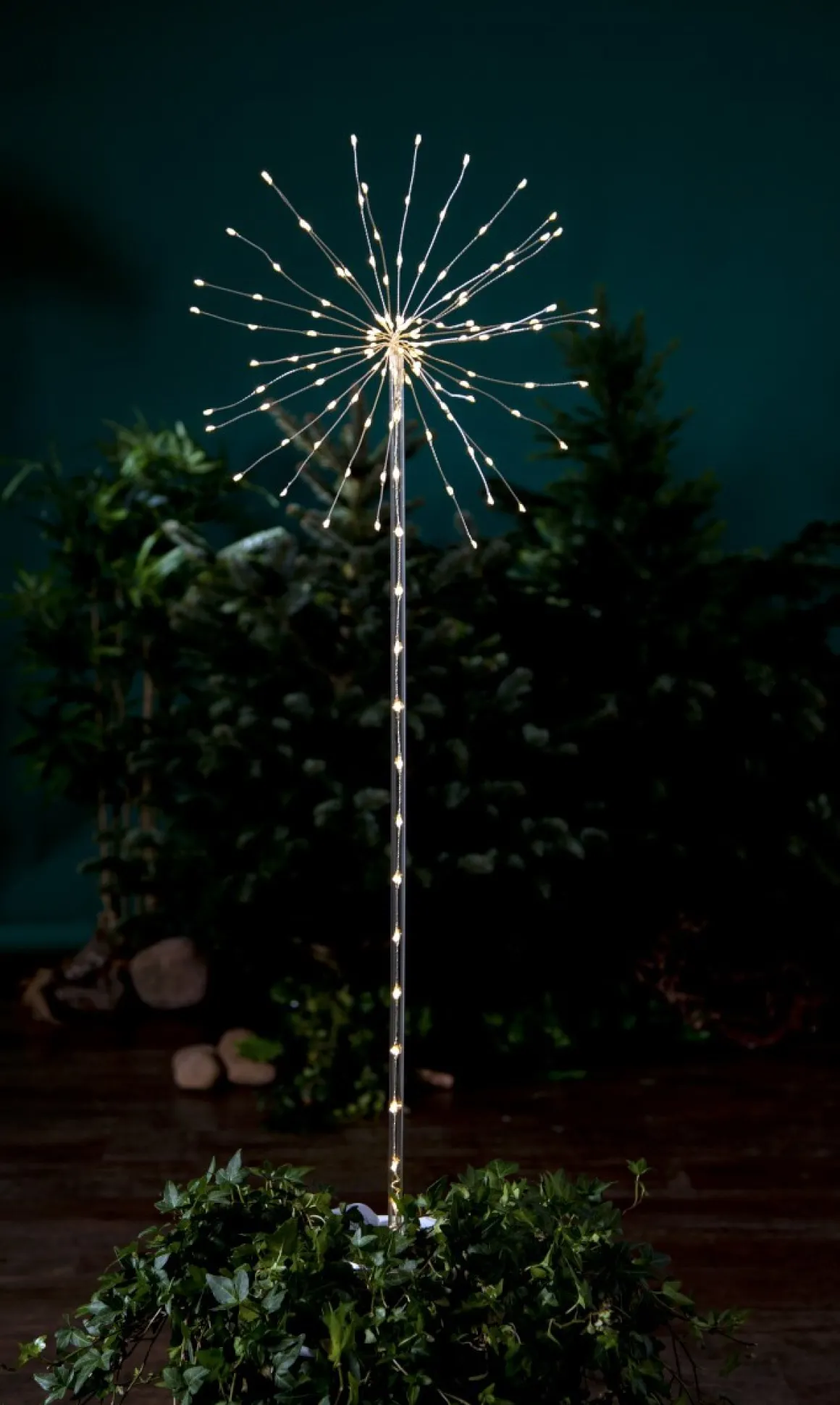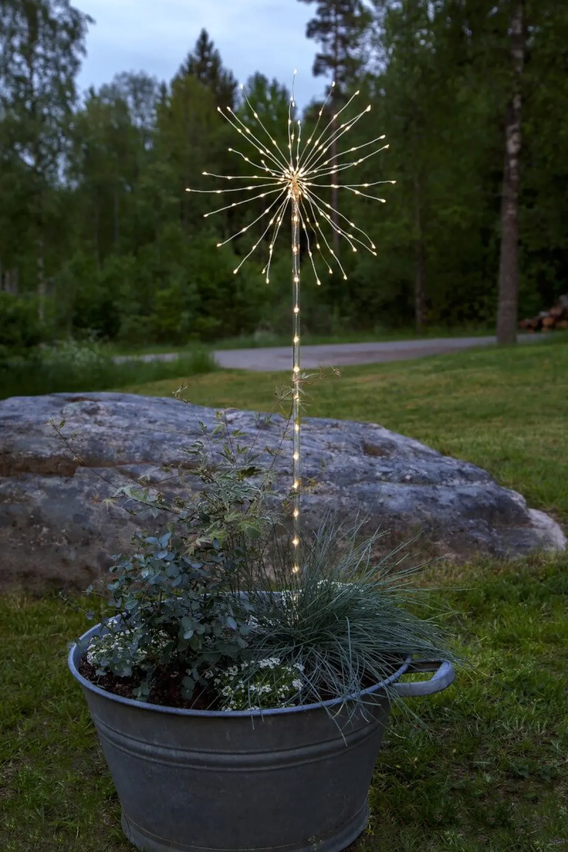 Batteridriven Firework från Star Trading för utomhus bruk med varmvitt sken som lyser upp trädgården stämningsfullt. Batteriboxen har chaser box med 8 olika val av blinkade eller fast ljus och timerfunktion.