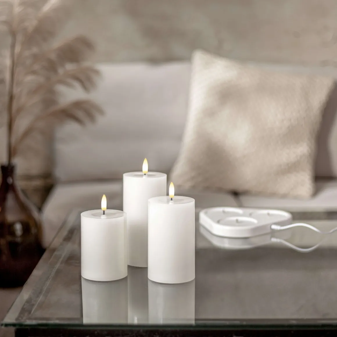 Flamme Charge från Star Trading är ett set med 3st vita Blockljus som är uppladdningsbara. Den tillhörande laddningsplattan har även en medföljande 80cm lång kabel med USB kontakt som enkelt går att kopplas in i en 5V adapter, adaptern ingår inte. Indikationslampan i varje ljus lyser röd under laddning och grön när ljuset är färdigladdad. Även om litium batterierna har överladdningsskydd så Låt EJ ljusen ladda längre än 3 timmar max!