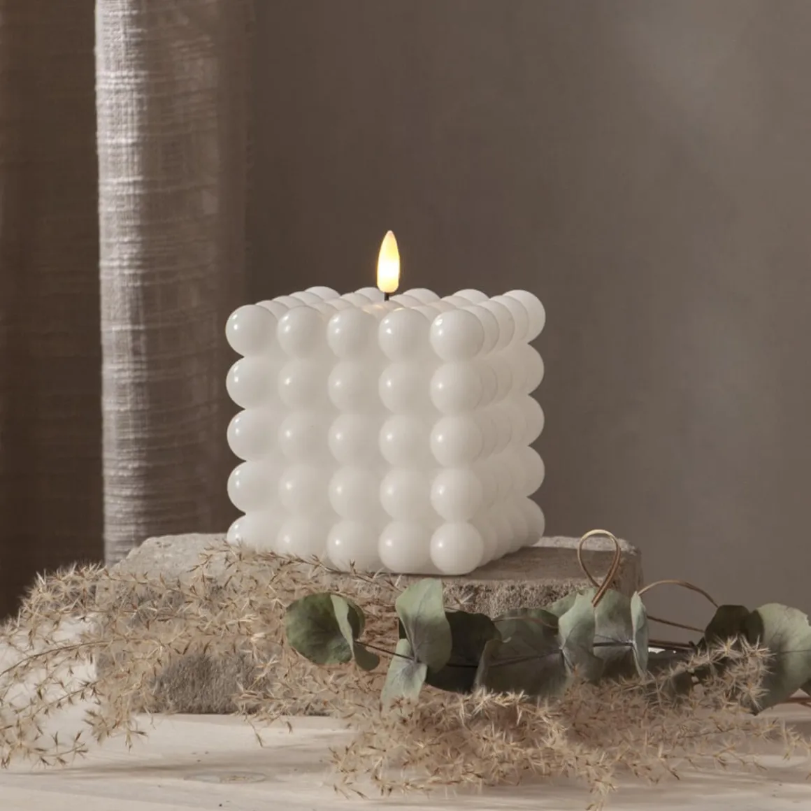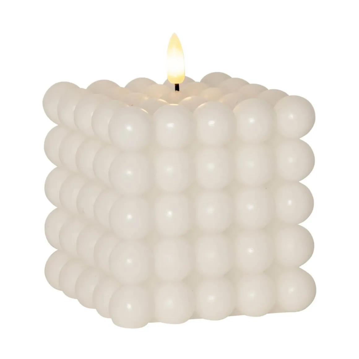 Flamme Dot är en ny serie batteridrivna ljus från Star Trading. Här ser du Dot som ett fyrkantigt ljus gjord av vitt vax med en bubblig yta. Ljuset är cirka 10×12,5cm inklusive lågan. Detta batteridrivna ljus blir en vacker dekoration, både ensam och i grupp ihop med övriga ljus. Självklart har Dot timerfunktion och när brytaren är på timerläget lyser ljuset i ca 25 dagar med en vacker realistisk låga i varmvitt. Den drivs av 2 AAA batterier, dessa ingår ej.