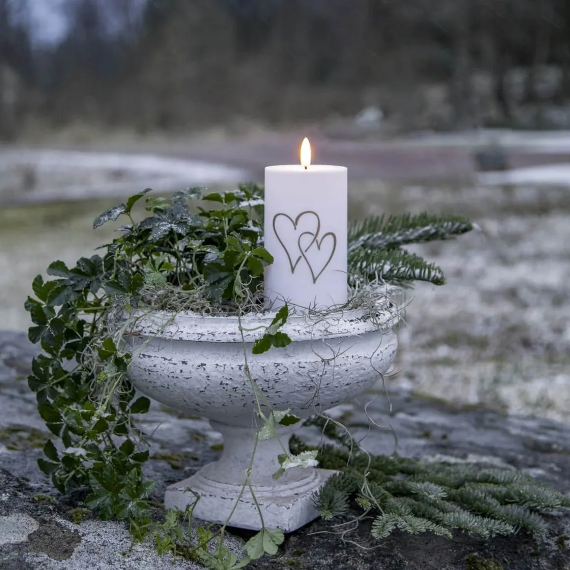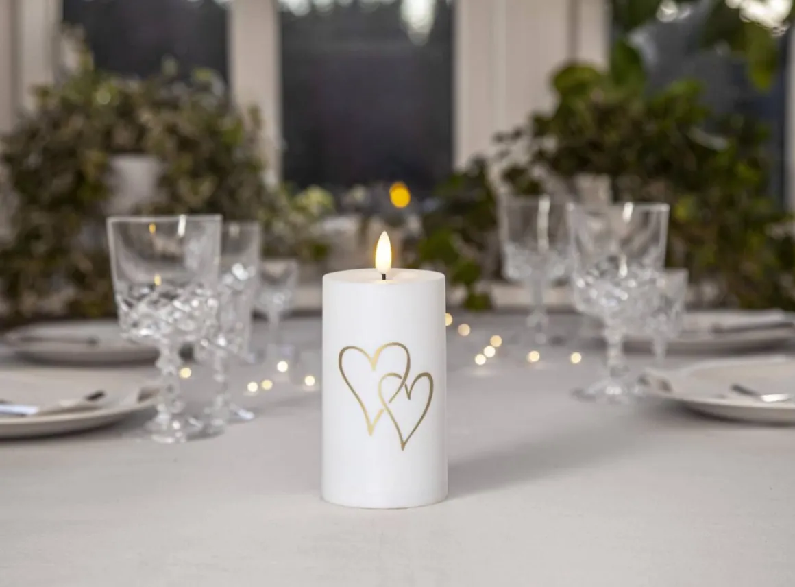 Flamme Heart är ett vitt ljus i plast med ett vackert tryckt hjärtmönster i guld. Den lyser upp med star tradings naturtrogna Flamme låga. Detta ljus passar lika bra inomhus som utomhus, i en lykta eller i grupp med andra uteljus från Flamme familjen. Detta batteridrivna ljus går att använda både med ljussensor och med timer. Önskar man sensor så sätts brytaren på ON läget, ljuset lyser då upp när mörkret faller. Sätter man brytaren på timer i stället så lyser ljuset i 6 timmar, sedan slocknar den i 18 timmar och lyser upp nästkommande dag igen.