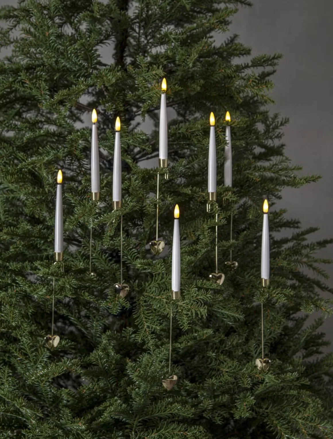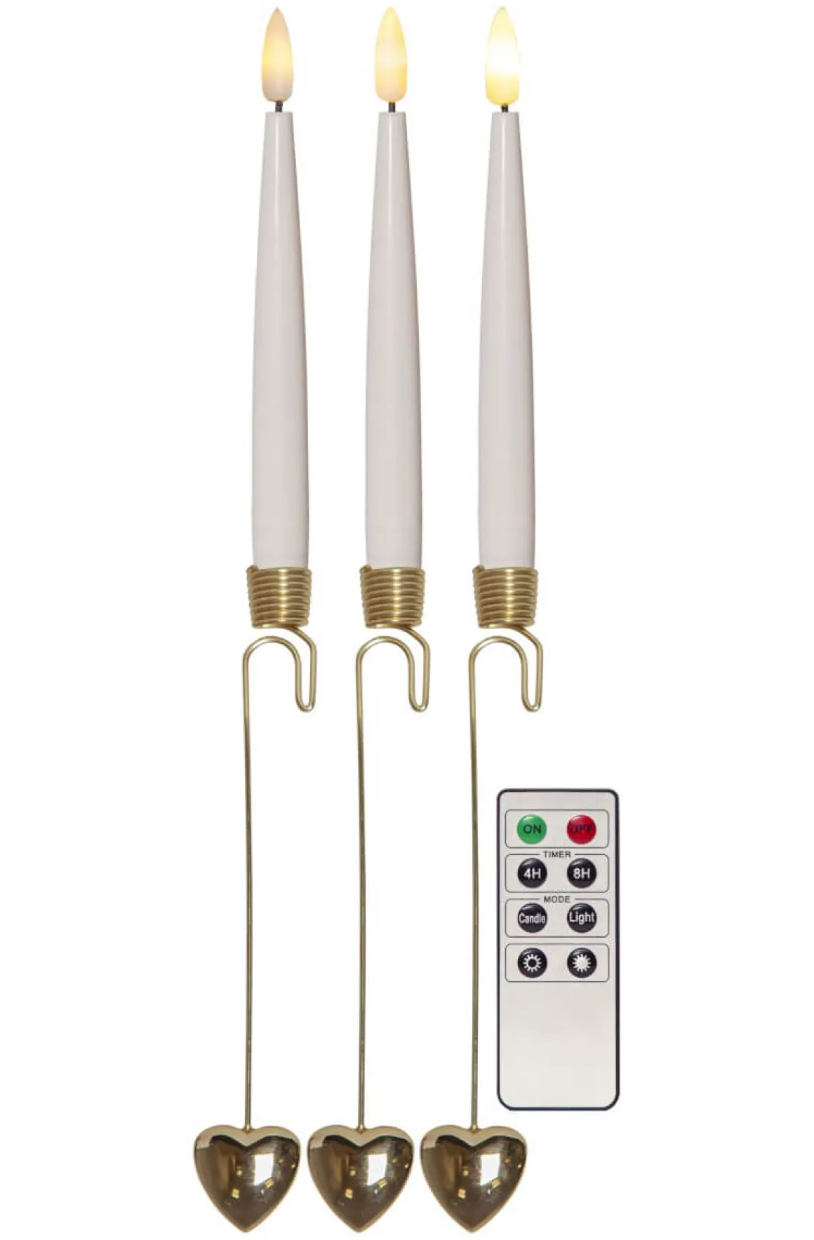 Dekorativ julgransbelysning i form av ett batteridrivet ljus med vackra hållare i metall från Star Trading. Ljusen är endast för inomhusbruk. Hållaren har en krok för enkel montering i julgranen. Längst ner på hållaren sitter ett dekorativt litet gulligt hjärta. Förpackningen innehåller 8 st ljus med hållare. Drivs gör de av ett AAA i varje ljus. Fjärrkontroll med timer funktion, justerbar ljusstyrka och val av fast eller flimrande ljus – toppen helt enkelt.