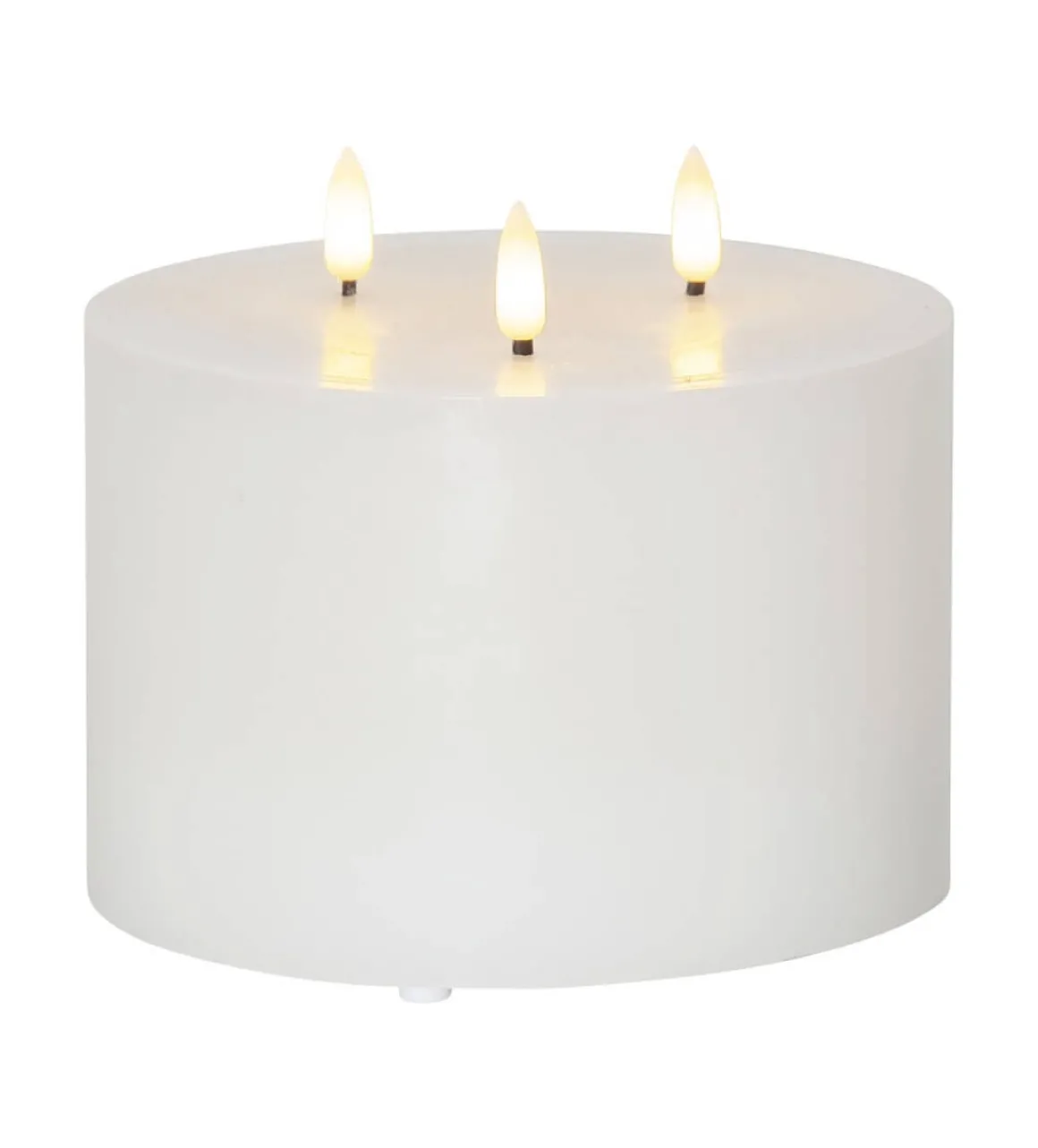 Nytt större vaxljus från Flamme serien som har 3 naturtrogna varmvita lågor med inbyggd timer. Höjden på 13 cm är inkl. lågan.