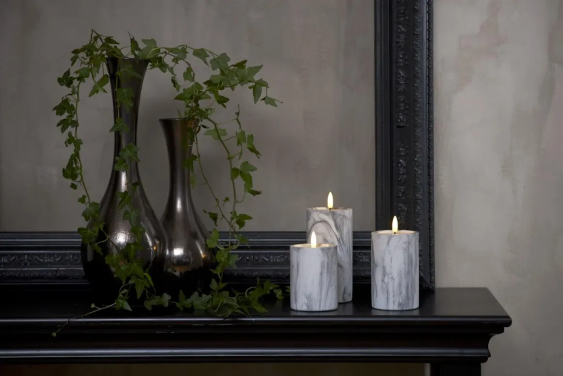 Men har du sett så vackert? Blockljus på 17,5 cm med den otroligt verklighetstrogna lågan Flamme från star trading med ett hölje av marmormönstrad betong. Självklart har ljuset en inbyggd timer så du enkelt kan ställa in när du vill att det ska lysa.