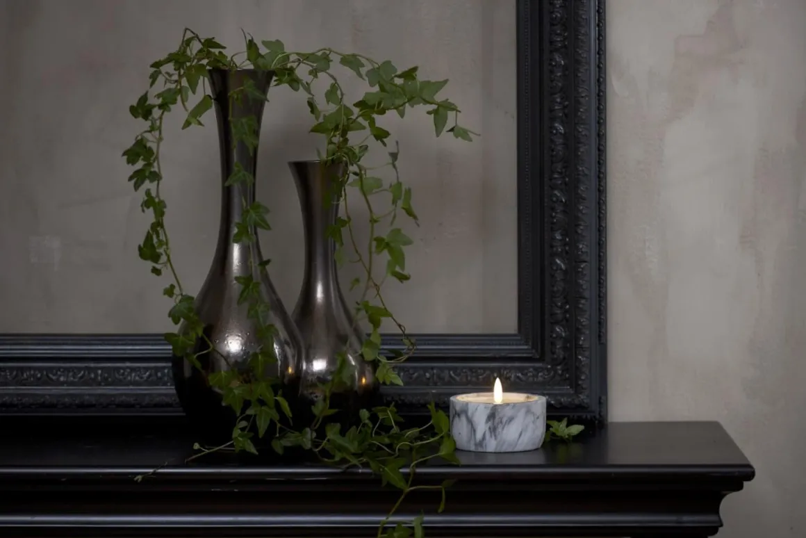 Men har du sett så vackert? Blockljus på 7,5 cm med den otroligt verklighetstrogna lågan Flamme från star trading med ett hölje av marmormönstrad betong. Självklart har ljuset en inbyggd timer så du enkelt kan ställa in när du vill att det ska lysa.