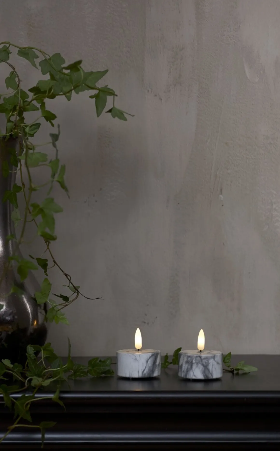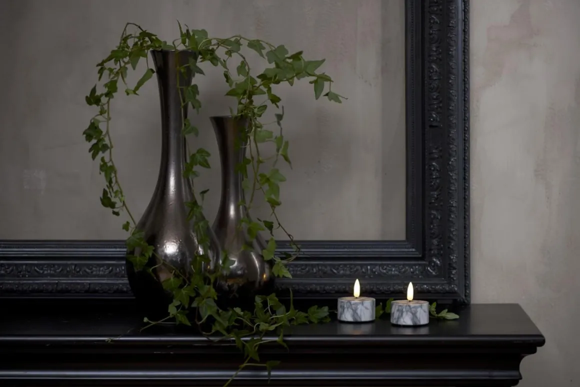Så vackra 2 pack värmeljus (modell större) med den verklighetstrogna Flamme lågan från Star Trading nu med ett hölje i marmormönstrad betong. Hur vackert?! Självklart har ljusen en inbyggd timer så du enkelt kan ställa in när du vill att dem ska lysa.