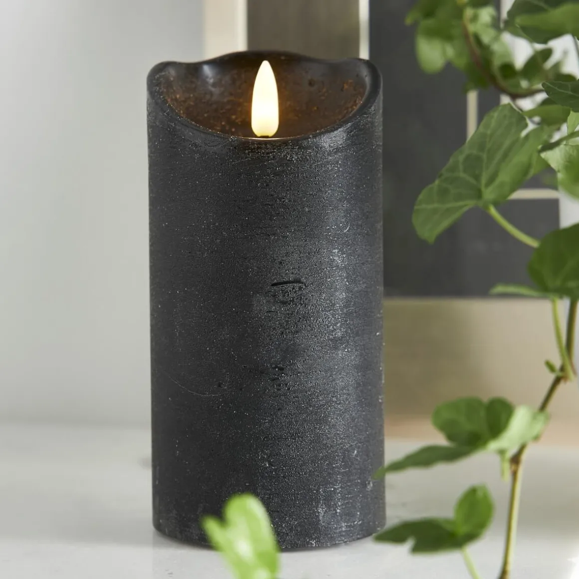 Mycket verklighetstroget vaxljus med den populära Flamme lågan. Rustik är en ny serie ljus med något grövre yta än de andra ljusen. Ljusen finns i flera olika höjder och färger. Självklart har alla ljusen inbyggd timerfunktion. Här ser du Rustic svart 15 centimeter.