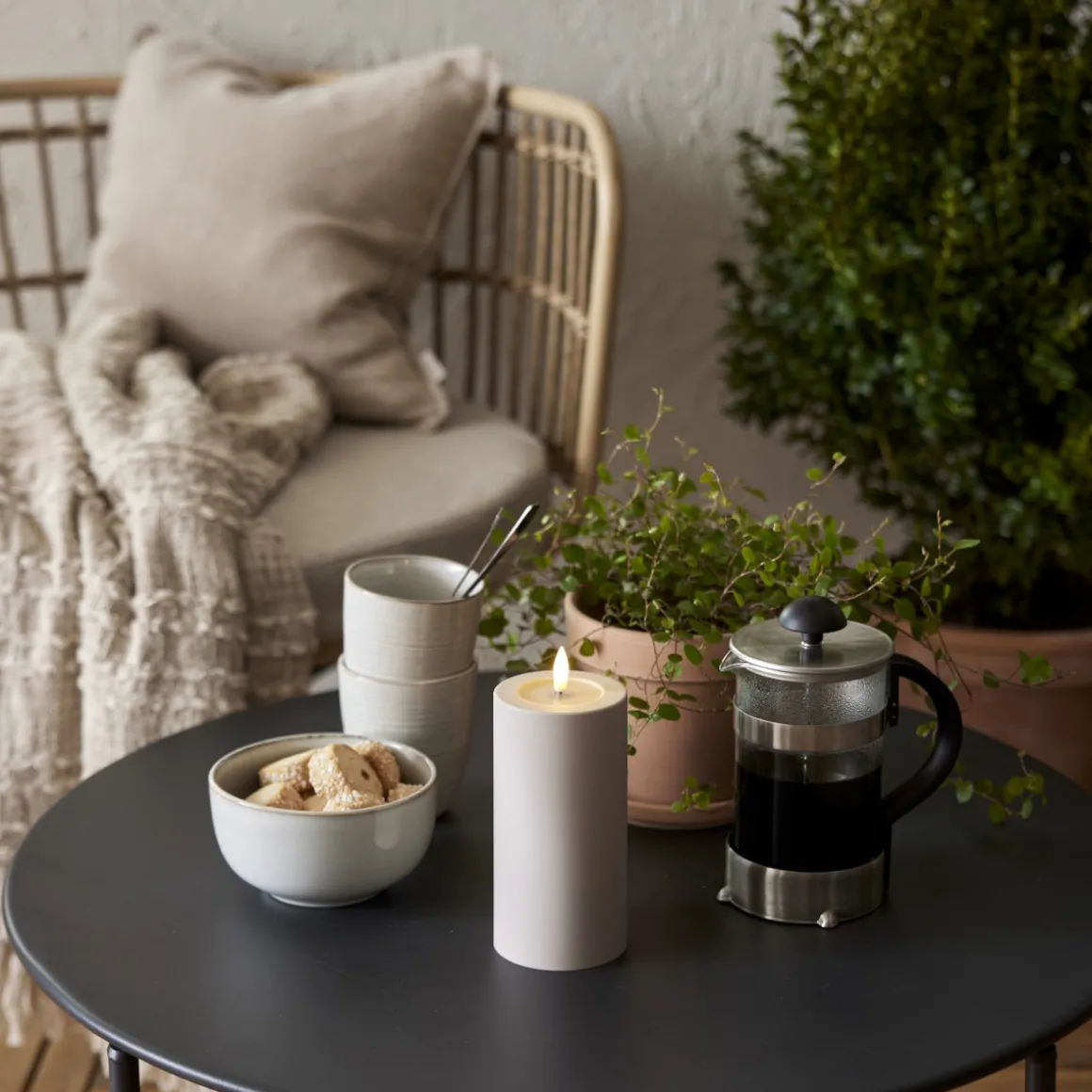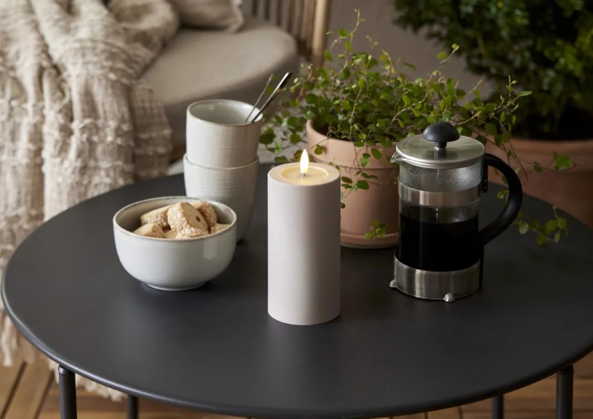 Flamme Soft Beige batteriljus med naturtrogen Flamme-låga lyser i 1000 timmar. Tillverkat i plast med sammetslen yta och blank vaxliknande nedsänkning för realistisk look. Mått: 7,5 cm diameter, 15 cm hög (17,5 cm med låga). Perfekt som dekoration, inomhus eller utomhus, ensam eller i grupp. Inbyggd timer för 6h varmvitt sken. Drivs med 2 AA-batterier (ingår ej). Skapa mysig stämning med Flamme-serien!