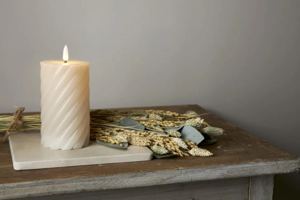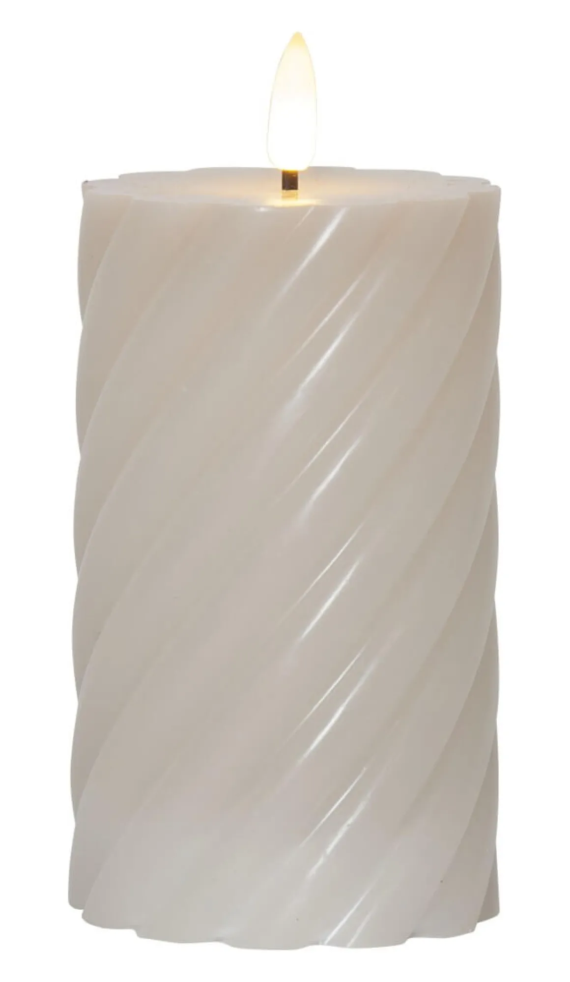Wohooo! Kolla in denna läckra nyhet! Beige Blockljus med twist formad vax i den populära Flamme serien. Den mycket naturtrogna lågan lyser med ett varmvitt mysigt sken. Självklart med inbyggd timer. (15 cm Hög)