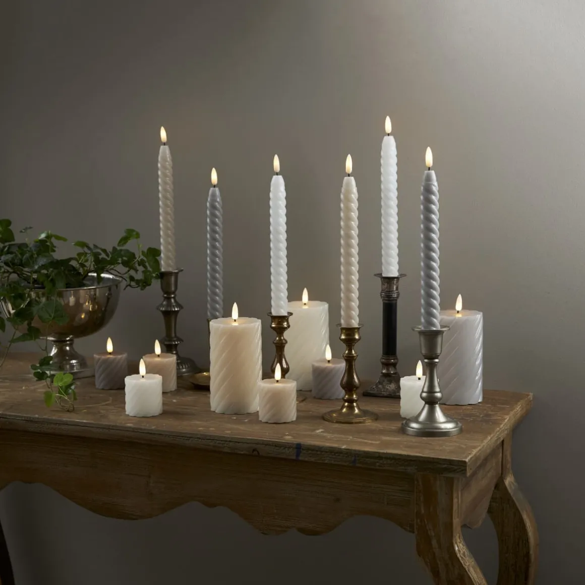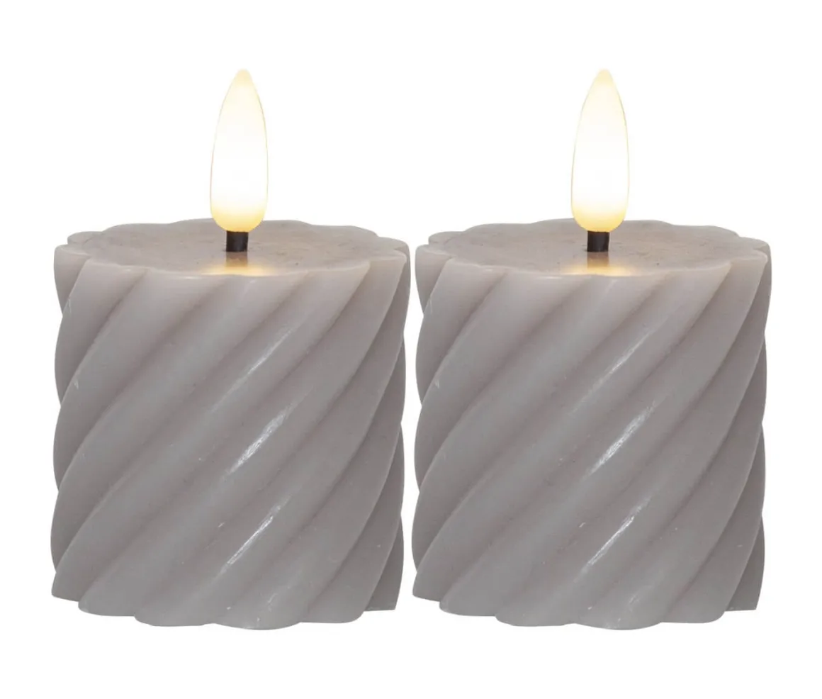 Wohooo! Kolla in denna läckra nyhet! Gråa (2-pack) Votivljus med twist formad vax i den populära Flamme serien. Den mycket naturtrogna lågan lyser med ett varmvitt mysigt sken. Självklart med inbyggd timer. (15 cm Hög)