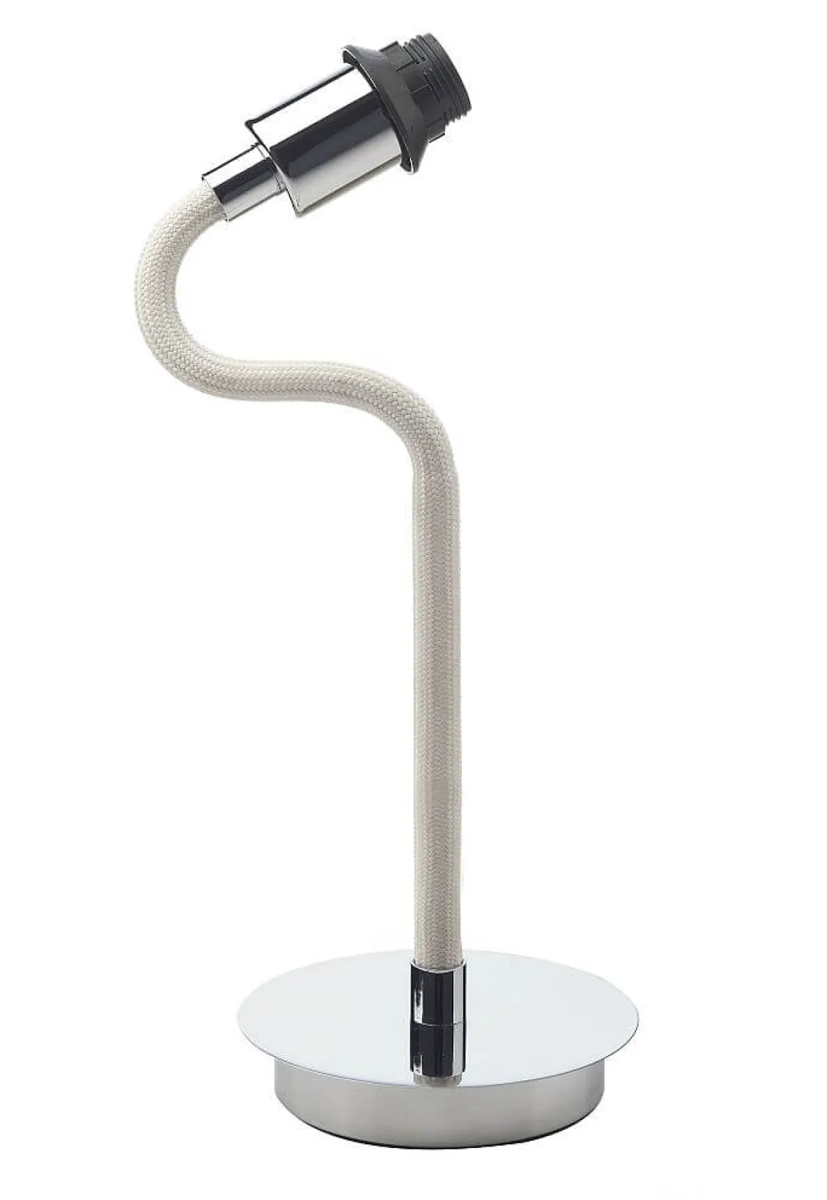 Härligt rolig bordlampa från Oriva med en kromad lampfot och en vit tygbeklädd flexarm som du kan rikta lite som du själv vill. Kombinera med en läcker skärm eller en cool Dekorations LED ljuskälla.
