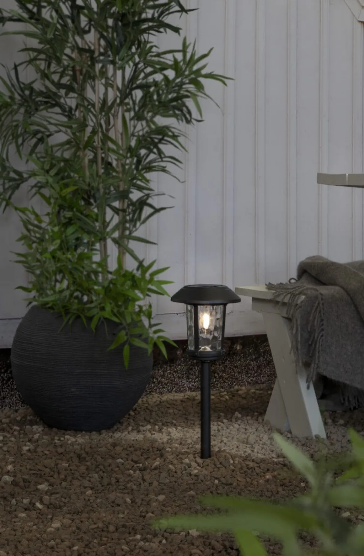Solcellsdriven gångbelysning tillverkad i pulverlackad aluminium och glas. Den lyser upp med 15 Lumen i varmvitt sken under natten och ger som du ser en härlig ljusbild i din trädgård..