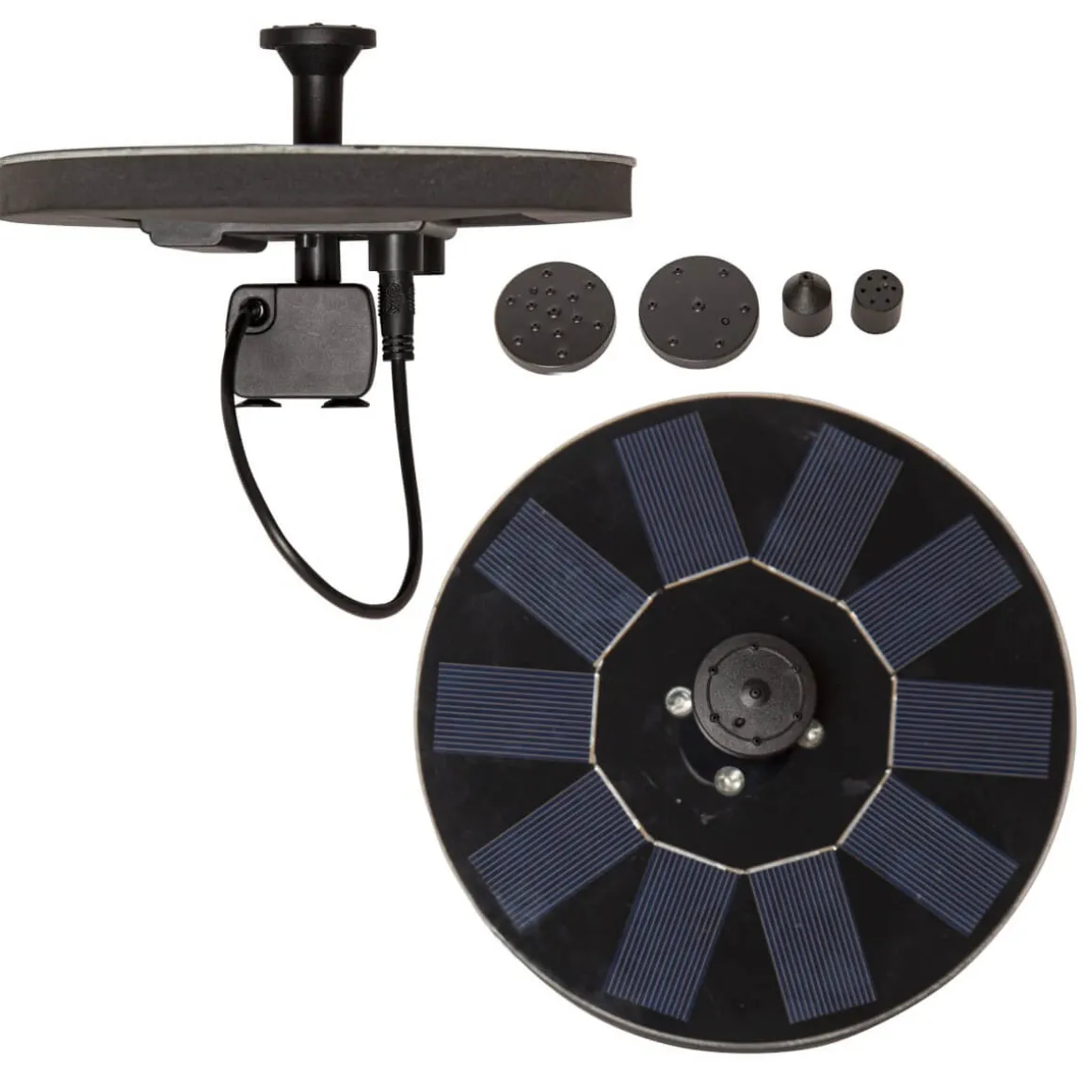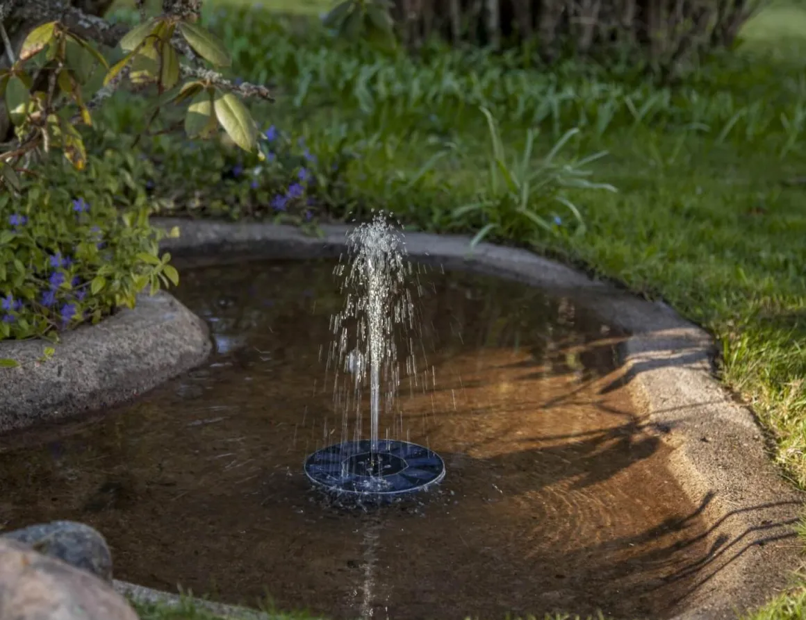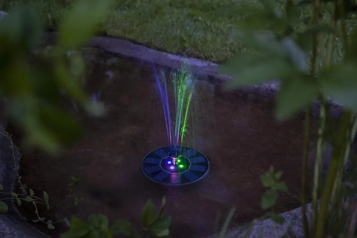Äntligen en fontän som drivs av solcellsenergi som laddar det medföljande batteriet. Solcellsfontänen passar för fågelbad eller en liten damm. Solcellspumpen levereras med 5 stycken olika munstycken som du kan byta mellan, pumpen placeras i botten på paneldelen och sist sätts kontakten från pumpen in själva solcellspanelen. Placera fontänen så att pumpen helt täcks av vatten och panelen med munstycke är placerad uppåt. Observera att pumpen EJ ska monteras innan det är dags att placera den i fågelbadet eller dammen, när solen laddar panelen så börjar vattnet att porla. När mörkret sedan faller så lyser även fontänen med olikfärgade LED lampor. Tänk på att fontänen endast fungerar om solen kommer åt att lysa på paneldelen så batteriet laddas.