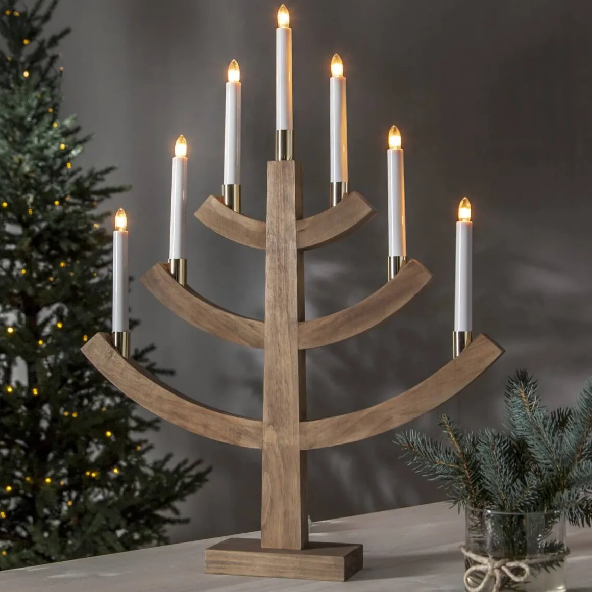 Brunbetsad 7-armad träljusstake med mässingbelagda ljushållare från Star Trading. Fin adventsljusstake att dekorera med till jul för den där rätta julkänslan.