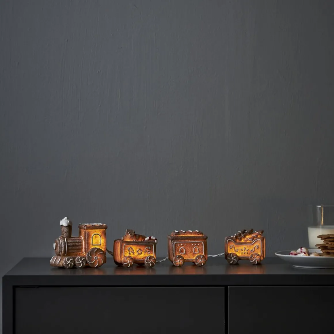 Tuff tuff tuff tuff….här kommer lilla pepparkakståget. Ett mysigt litet set med Lok och tre vagnar som sammankopplas av en batteridriven liten slinga. Perfekt liten dekoration att ställa tillsammans med pepparkakshuset eller på julbordet. Batterier köpes separat.