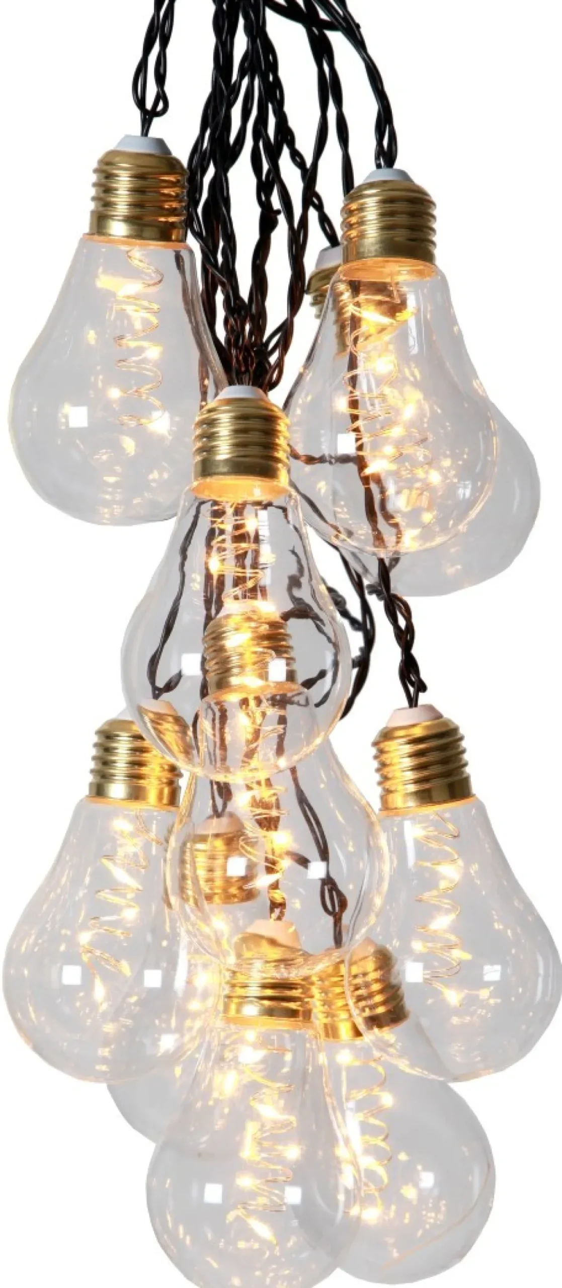 Som vi älskar denna dekorationsslinga, 10 stycken små lyktor i glas med formen av en glödlampa med en liten slinga i varje ”glödlampa” lyser vackert upp varthän du än placerar den! Den går fint att ha utomhus men då helst under tak.