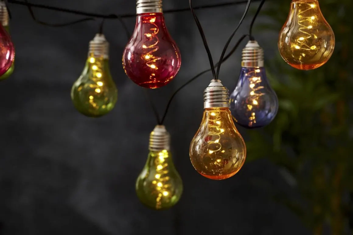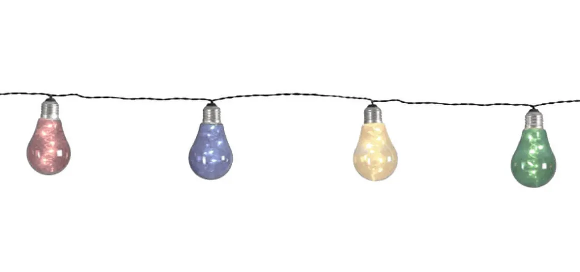 En riktig kundfavorit! Solcellsdriven Ljusslinga med 10 stycken olikfärgade glödlampor som lyser upp i mörkret.