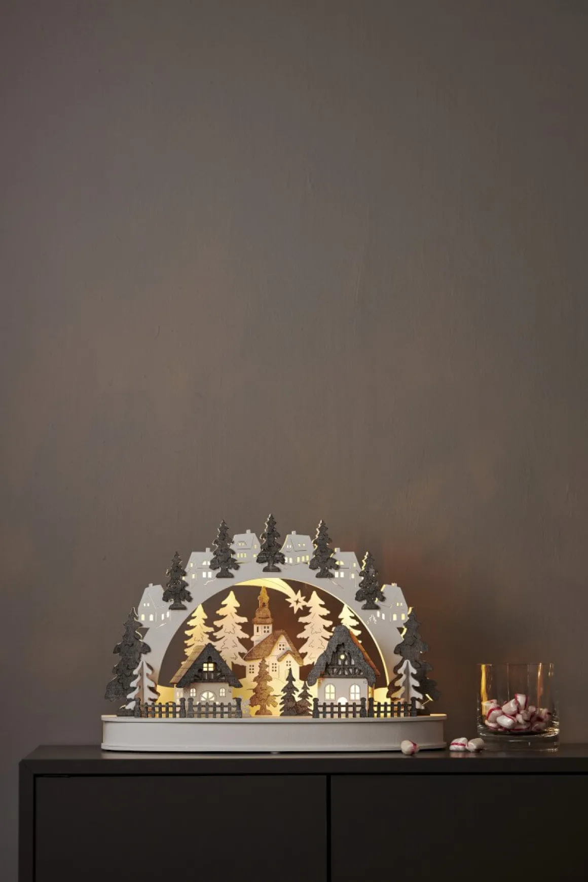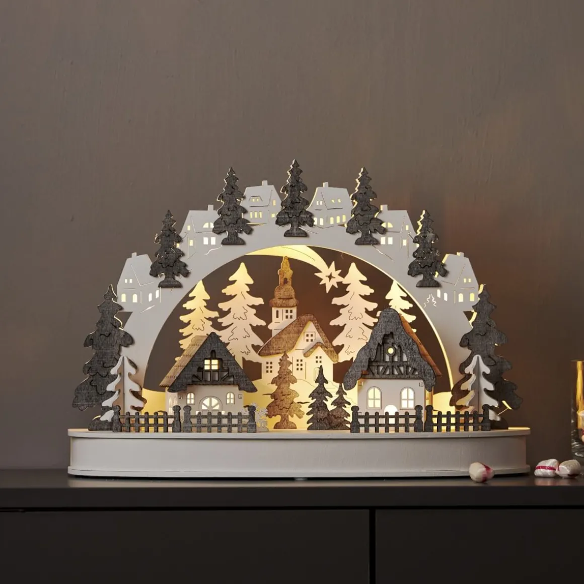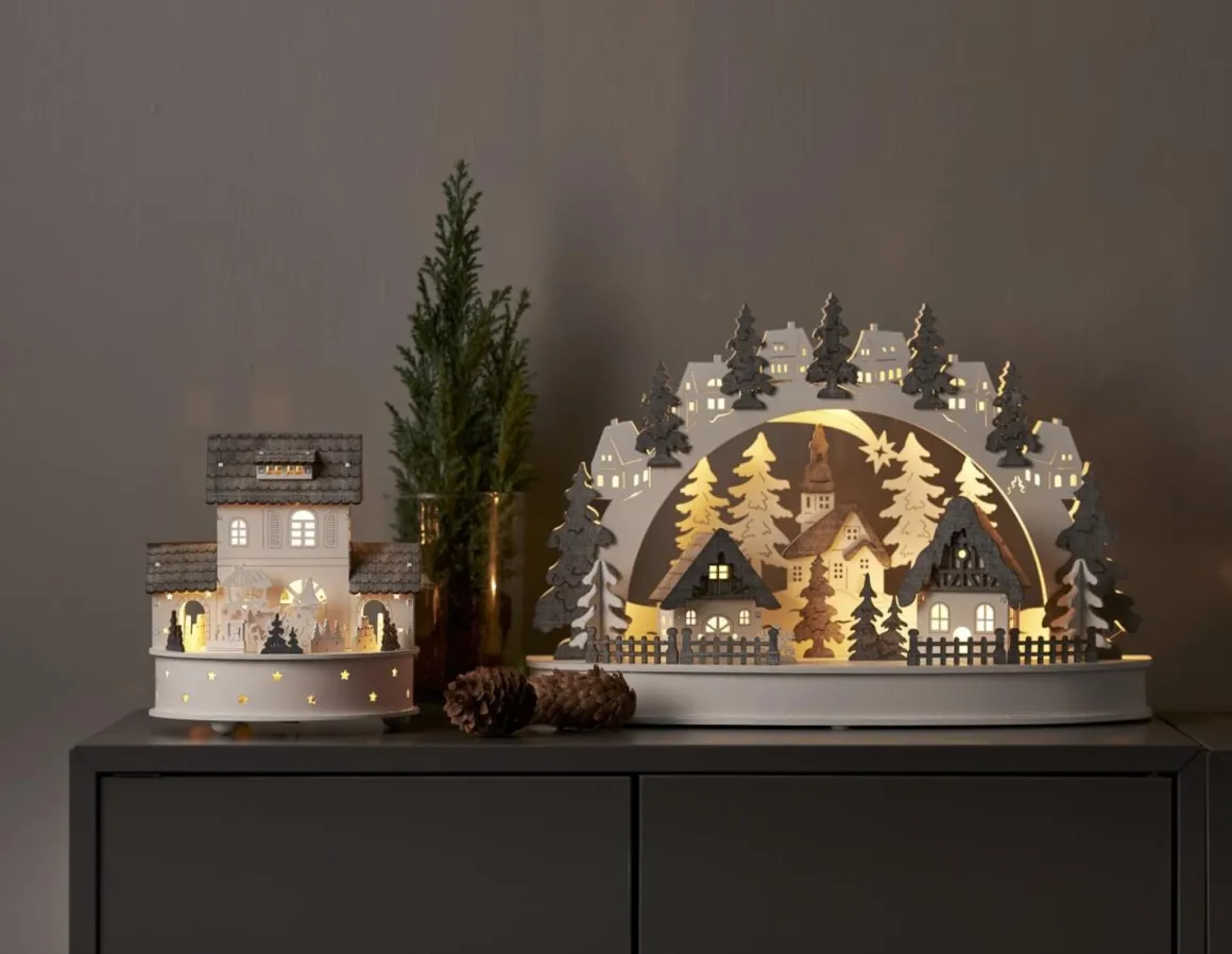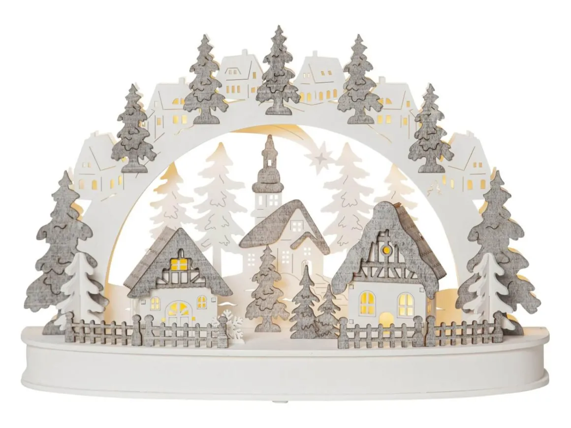 Underbart detaljrik laserskuren ljusstake i trä,basen har ett vackert utskuret landskap med små granar och hus och ovan basen böjer sig en båge med granar för att rama in den lilla detaljrika stugbyn. Dekorera till advent och jul, placera ljusstaken i ett fönster eller på en byrå för att få den perfekta julkänslan. Ljusstaken drivs med batteri med inbyggd timer så att du lätt själv kan ställa in när du vill att den ska lysa. Batterier köpes separat.