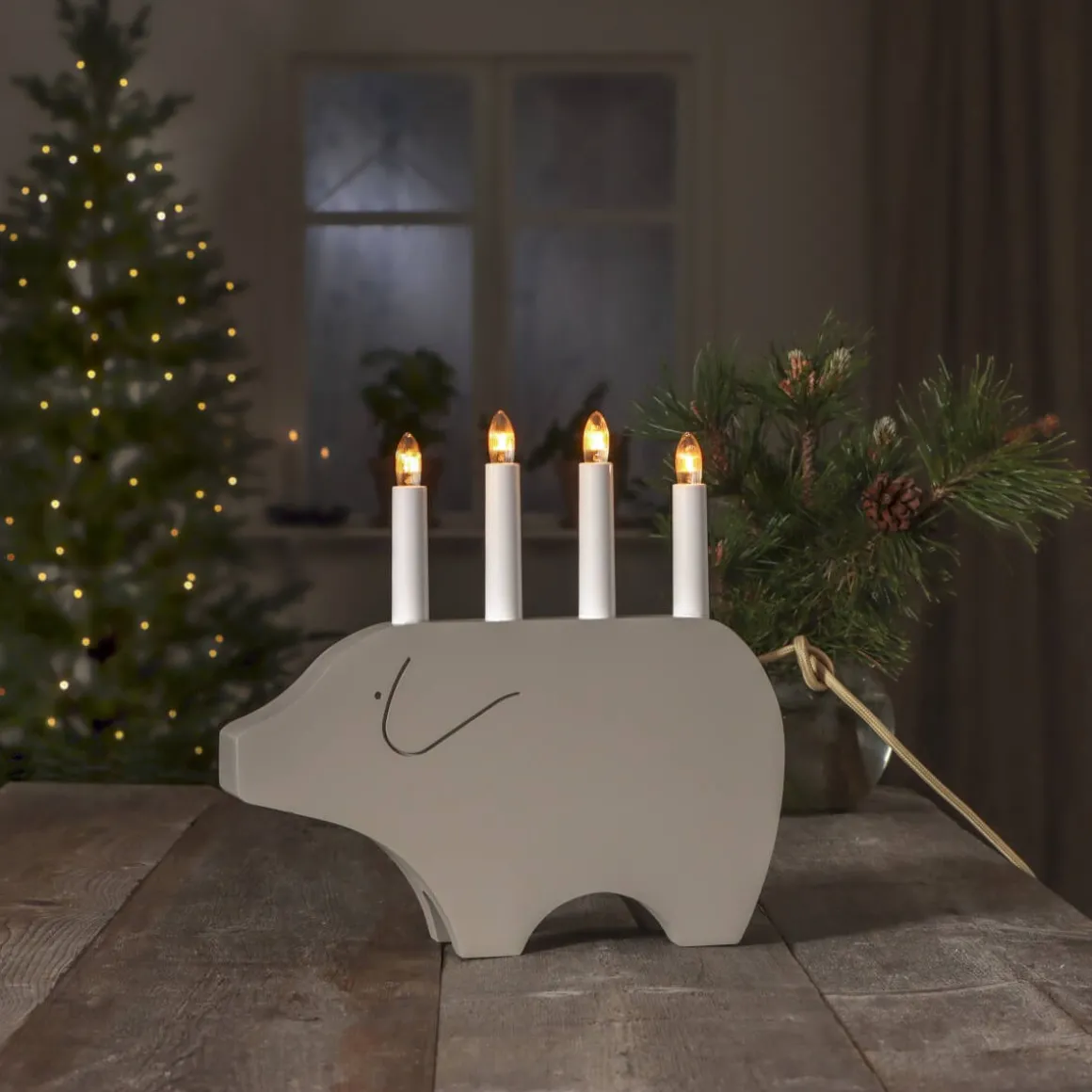 Adventsljusstake i form av en beige julgris, tillverkad i trä från Star Trading. Textilkabel med en liten knorr med brytare. Placera den i ett fönster eller och på en skänk. Härlig adventsljusstake att dekorera med till jul.