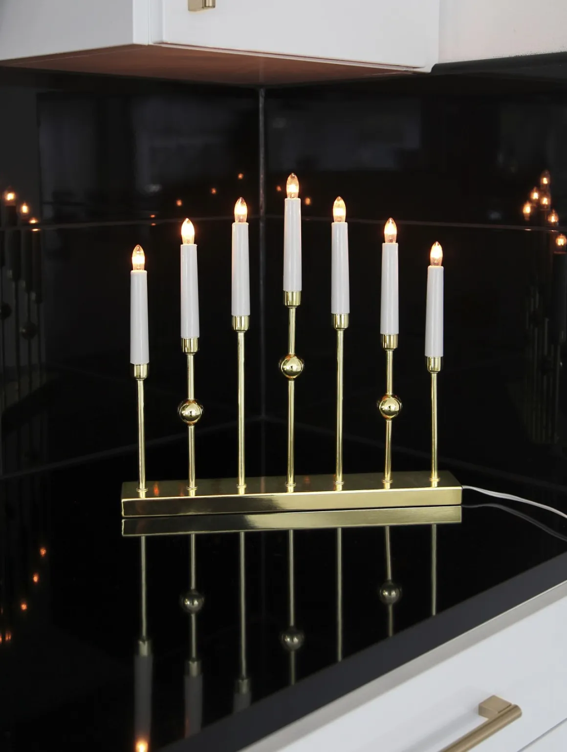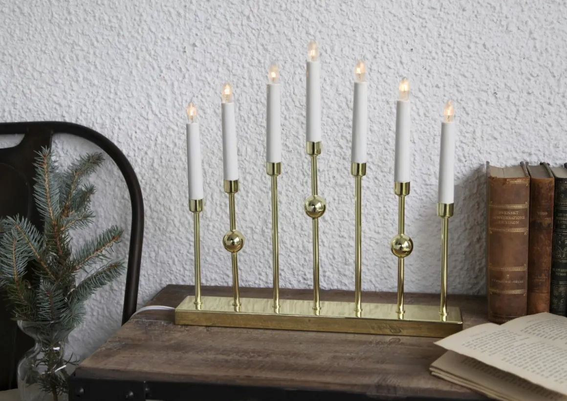 En läcker modern metallljustake i Mässing, med 7 ljuskällor ger den ett mysigt sken.