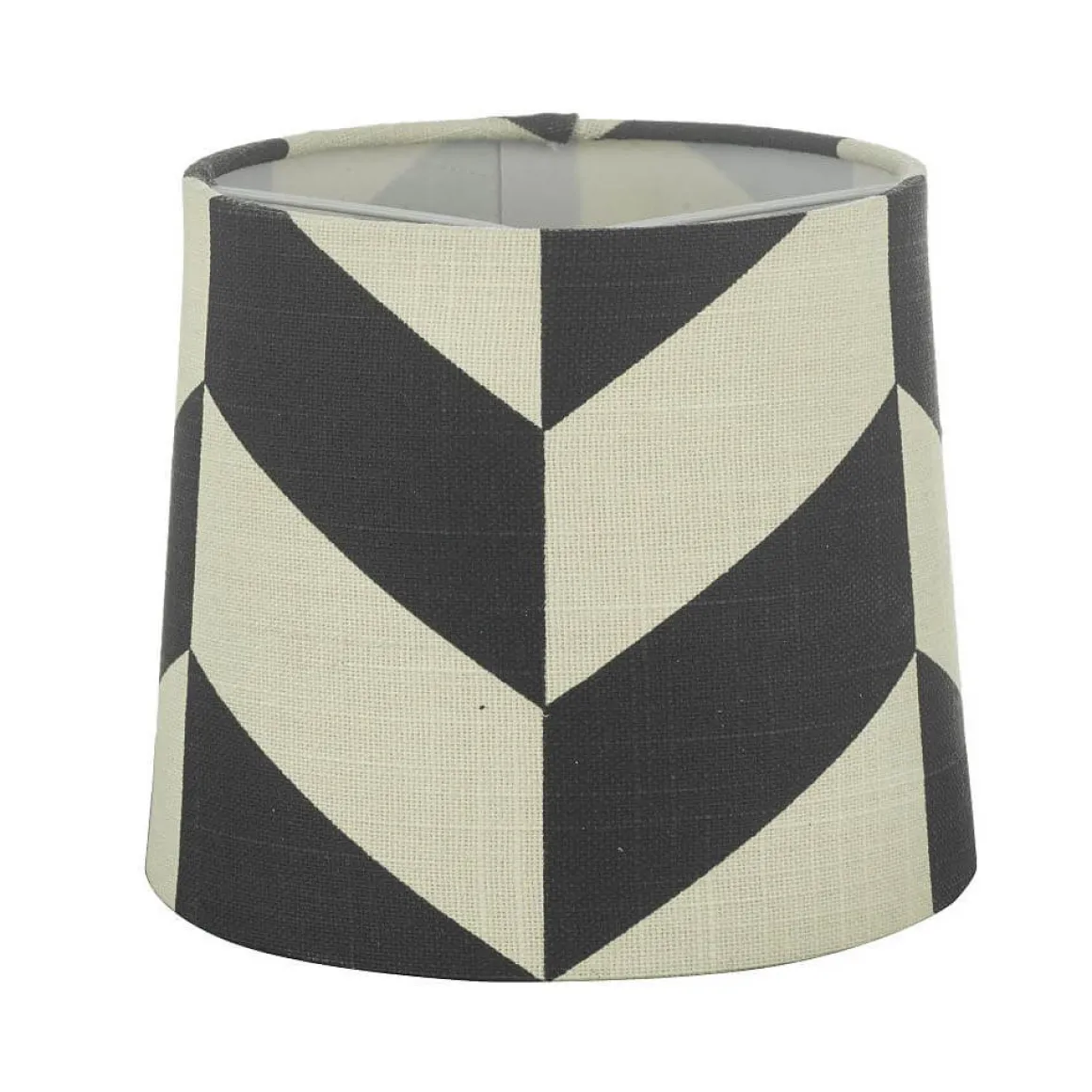Herringbone lampskärm från Oriva i härligt mönstrat Linne tyg. Här ser du lilla Herringbone i svart/vit 16 cm.