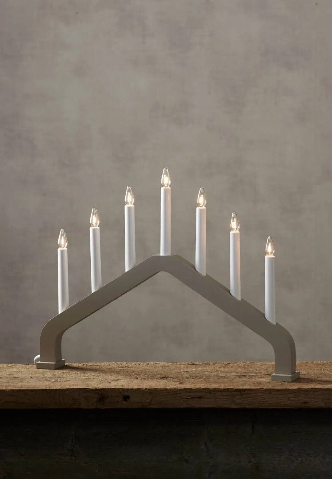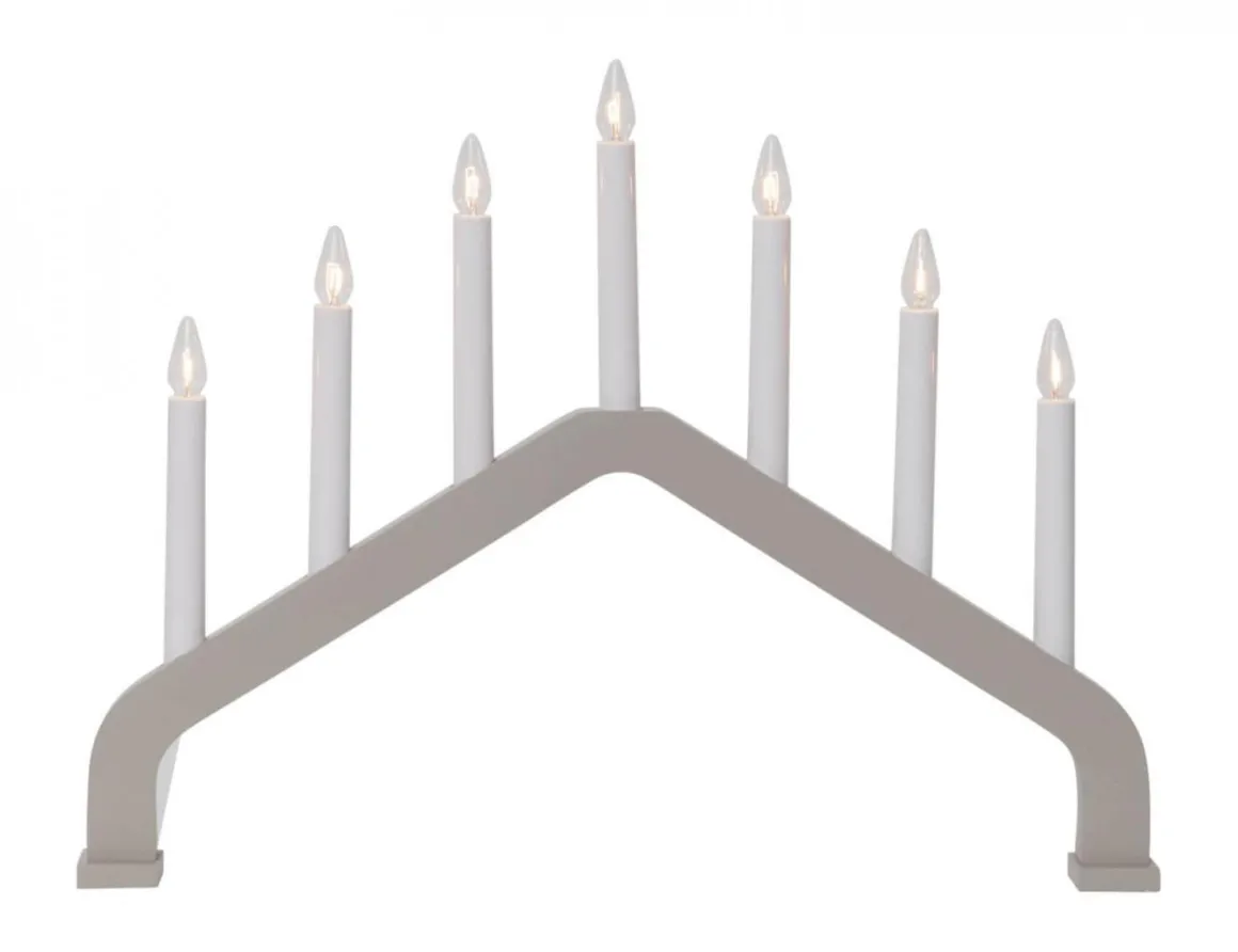 Beige träljusstake i stilren och enkel design och form med sju ljus för inomhusbruk.