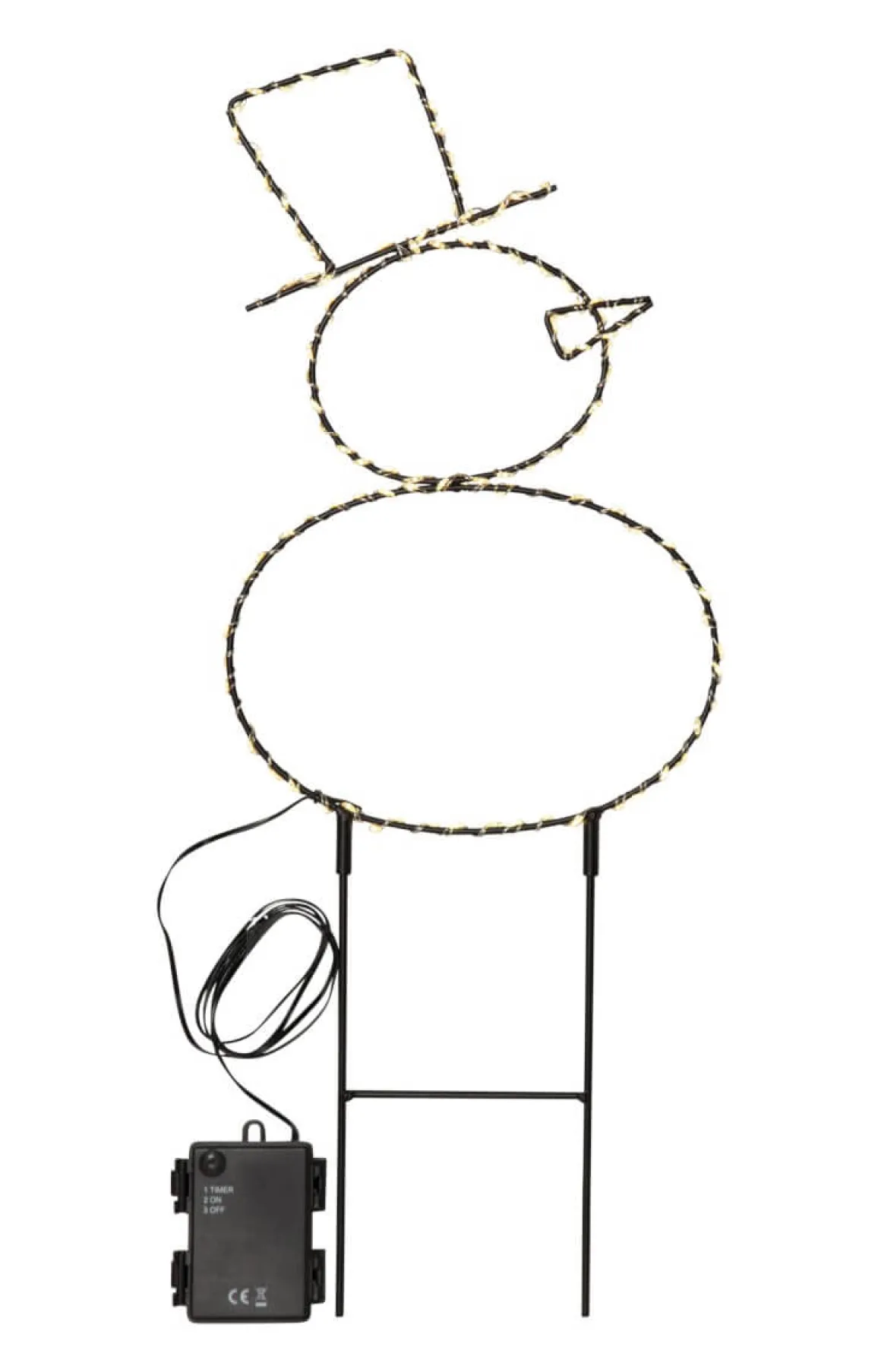 Iceman är en metallsiluett formad som en snögubbe. Batteridriven utomhusdekoration med timer funktion. Lättplacerad i kruka eller på marken. Ca 35 cm hög med avtagbara markspett. 120 varmvita LED ger ett vacket sken i mörkret.