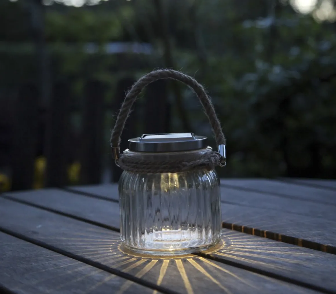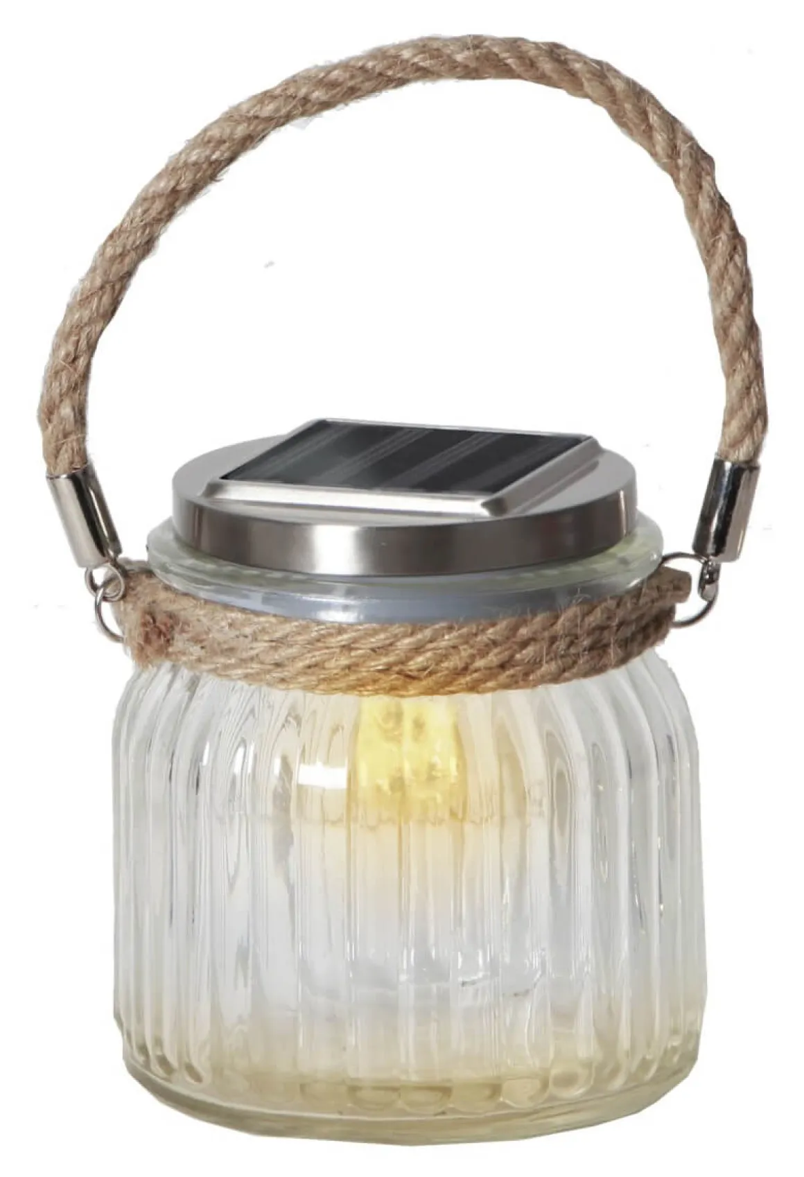 Dekorativ liten solcellsburk med ett dekorativt rephandtag. Burken har 1 LED-ljuskälla som ger ett vackert sken i mörkret. Jättefin dekoration att placera på bordet.