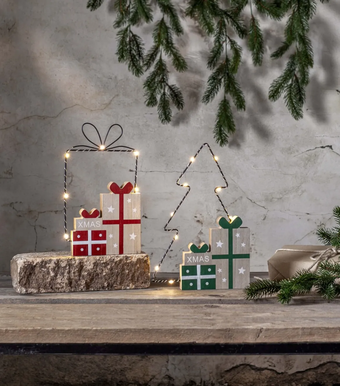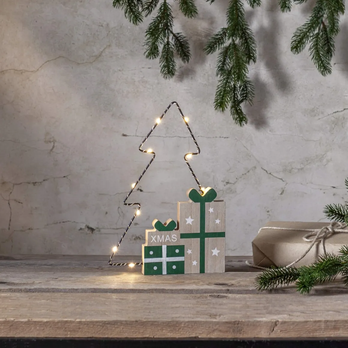 Skapa julstämning med denna charmiga juldekoration! Siluetten i metall är formad som en julgran och pryds av fint målade träpaket. De små virade LED-lamporna lyser vackert genom granen och ger ett magiskt sken. Perfekt för att lysa upp en hylla eller ett fönster. Den drivs av batteri, vilket gör det enkelt att placera den var du vill utan att tänka på sladdar.