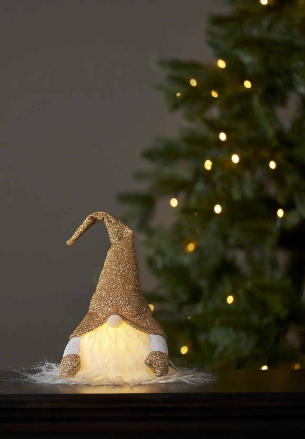 Meeen hur söt får man va? Super gullig liten batteridriven tomte med guldglittrig luva med matchande vantar. Så enkel dekoration att pynta med i ditt hem och stuga för den där rätta julkänslan.