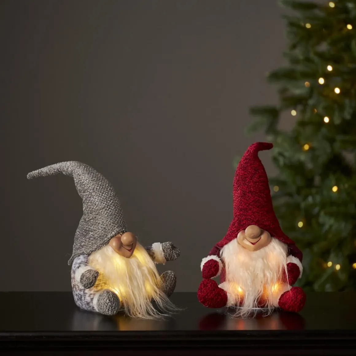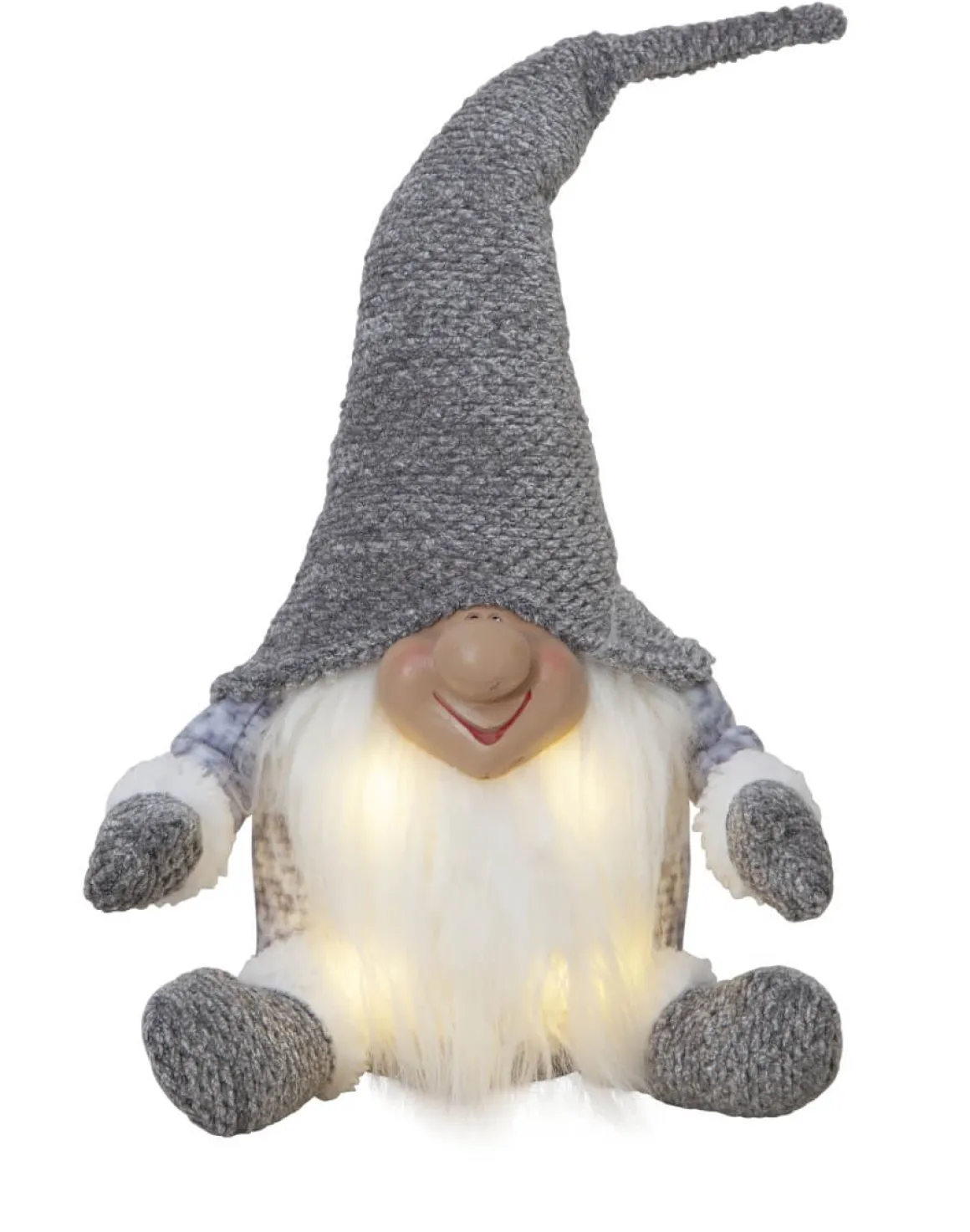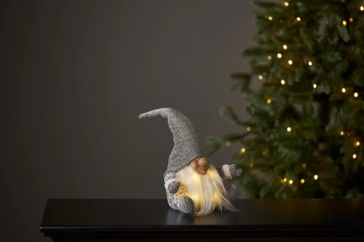 Liten mysig grå jultomte med lyse i kroppen från star trading. Drivs med batterier.