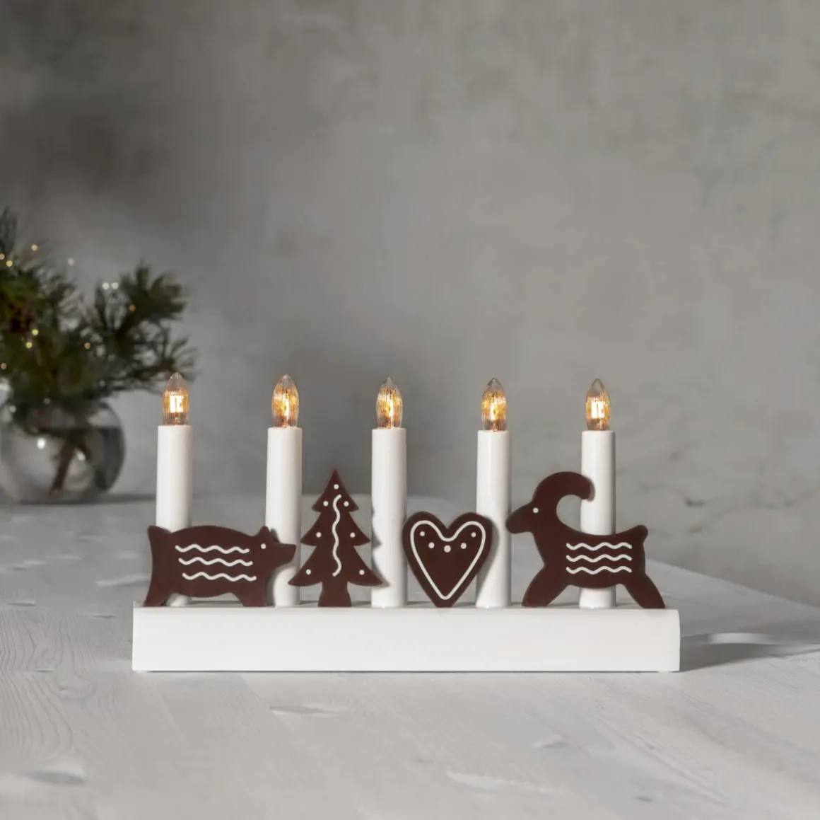 Så söt liten träljusstake som passar i de små fönstren såväl som i de stora här vackert dekorerad med pepparkakshus pepparkaksgranar, 5 ljuskällor skapar härlig julstämning i ditt hem