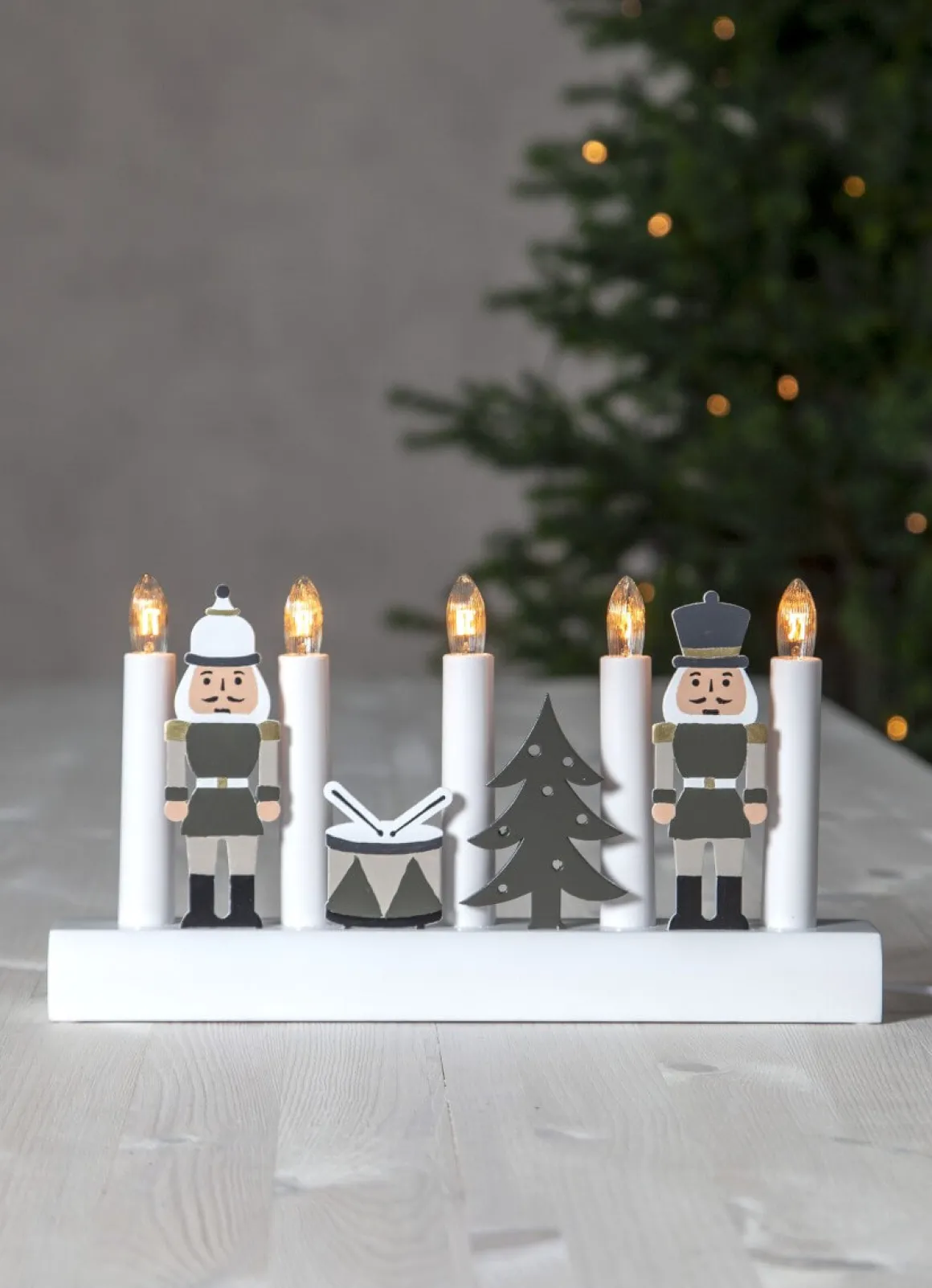 Vitlackad träljusstake med 5 ljuskällor från Star Trading. Ljusstaken är vackert dekorerad med två små nötknäppare, en trumma och gran. Lyser upp med ett varmt och mjukt sken i rummet och skapar en mysig julstämning.