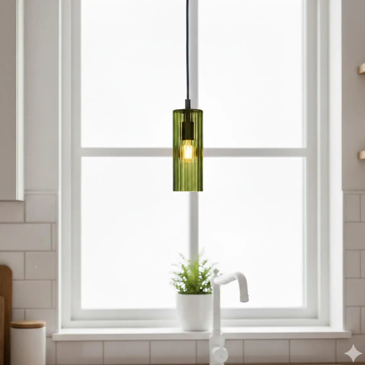 Upptäck Cottex Kiera takpendel i läcker grön ton. Cylinderformad skärm i munblåst, ribbat glas skapar vackert ljusspel och mjuka skuggor. Det gröna glaset ger varmt, inbjudande sken – ideal för kök, matplats, hall eller vardagsrum.