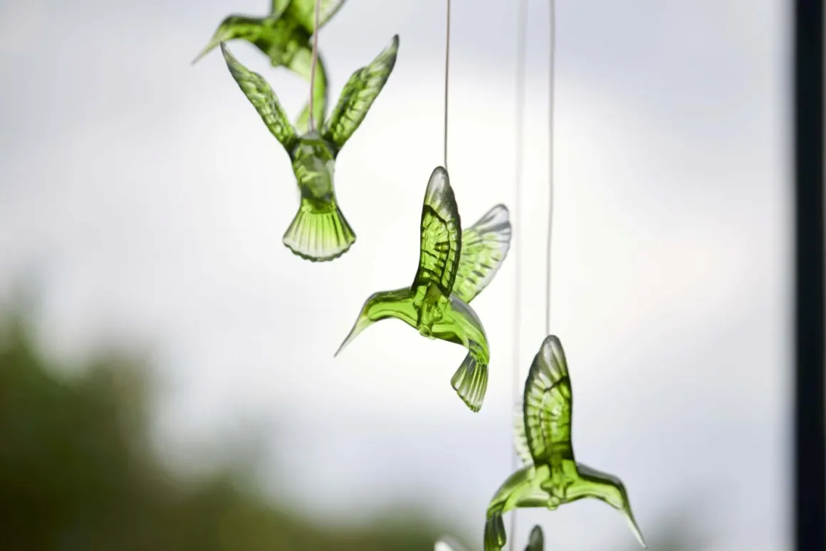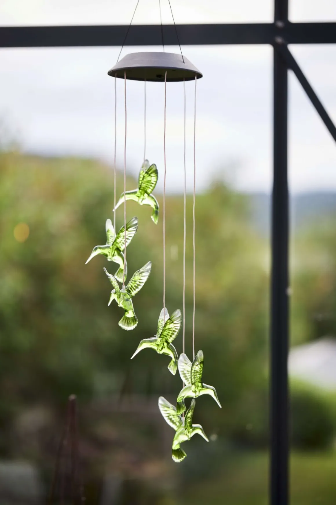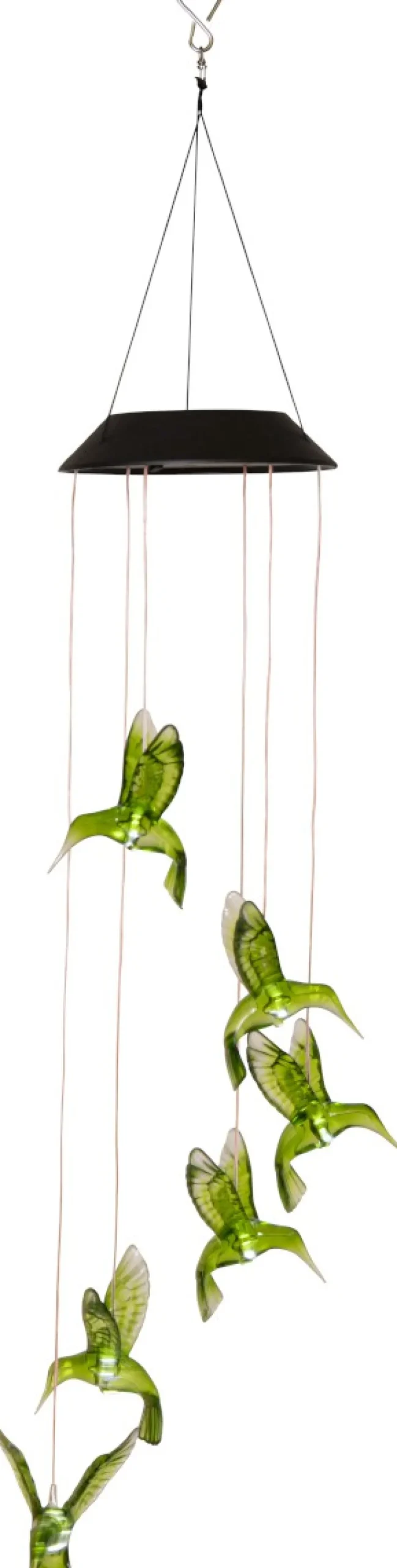 Solcellsdriven mobil från Star Trading med gröna kolibri-fåglar som blir en vacker dekoration i trädgården eller på balkongen. Under dagen pryder de gröna fåglarna din uteplats, och när mörkret faller ger de ifrån sig ett fint ljus. Denna dekorativa mobil skapar en magisk stämning och är perfekt för att lysa upp din utomhusmiljö både dag och natt!