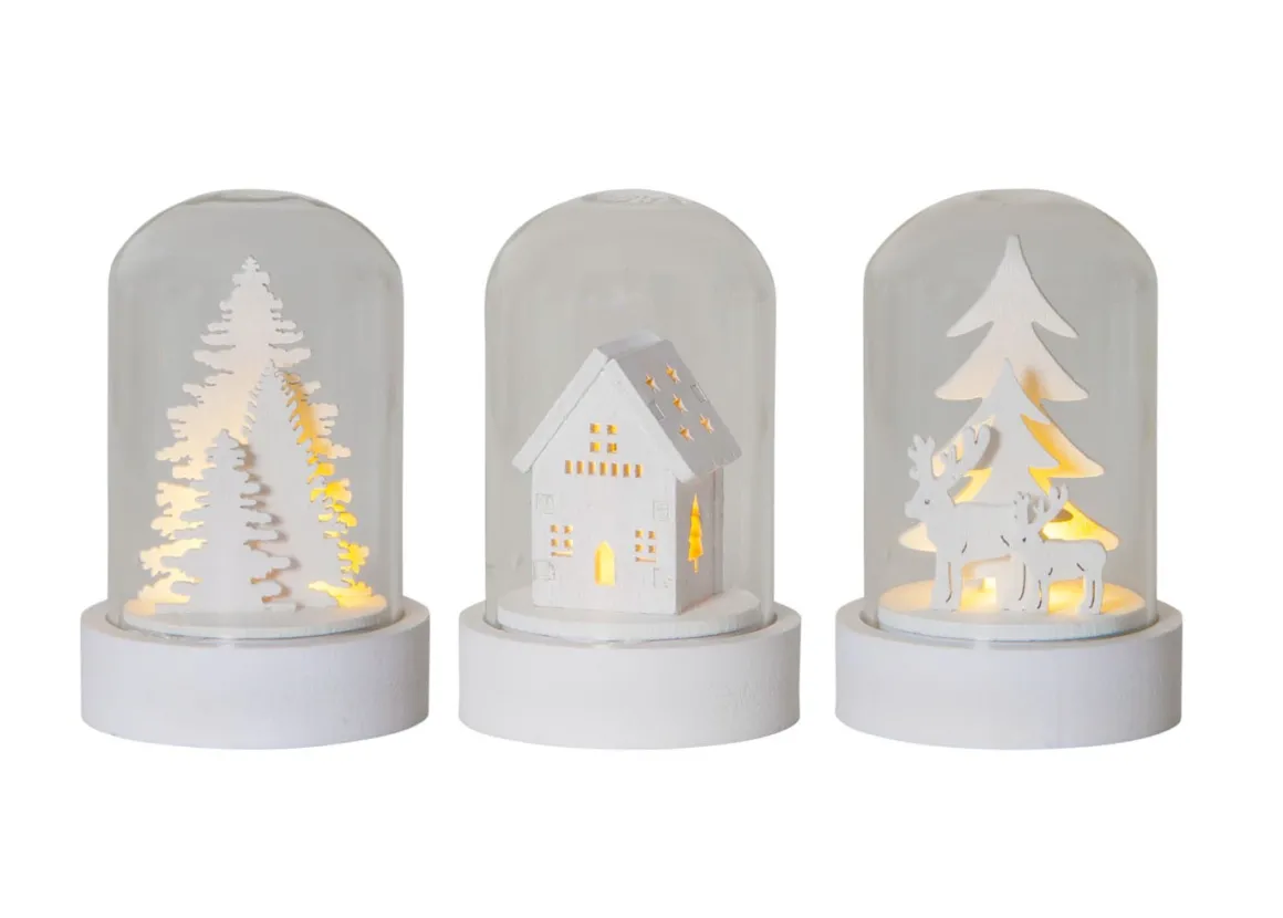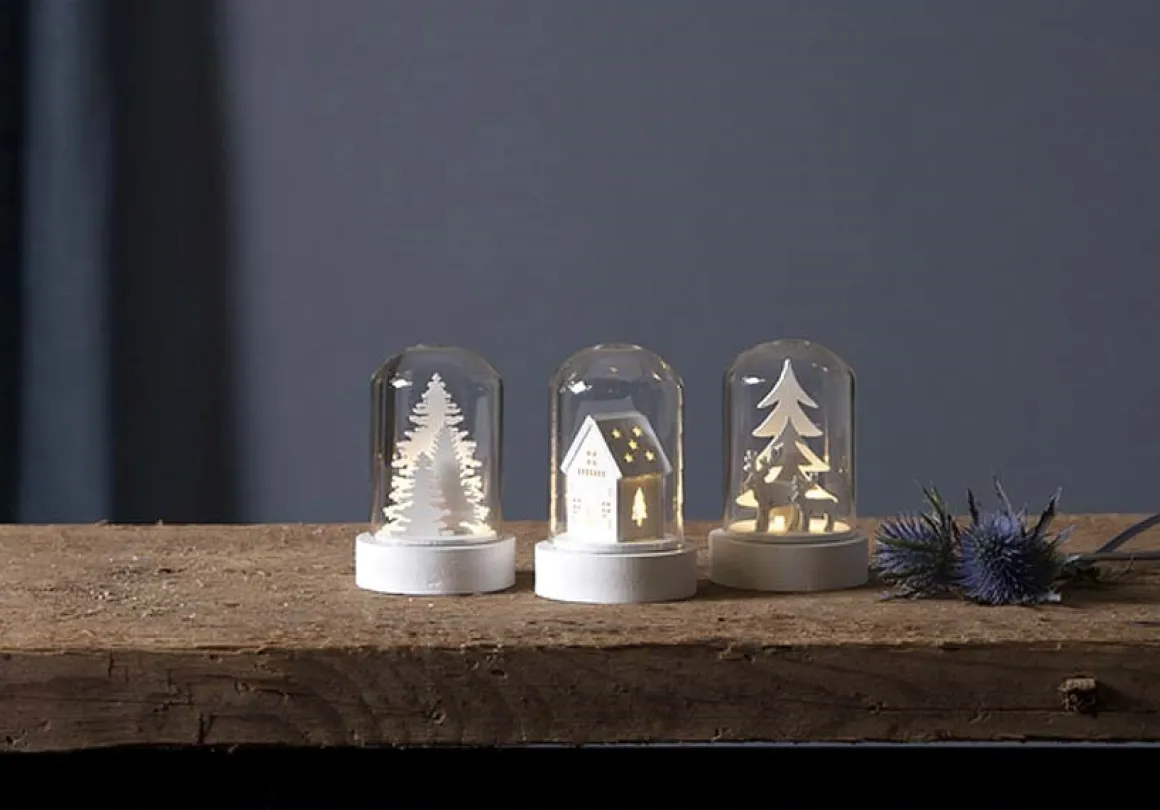 Så vackra små glaskupoler med laserskurna dekorationer i trä inuti. Underverken drivs med batteri och är på så sätt lättplacerade i flesta hem. Vi bara älskar denna lilla nyhet!