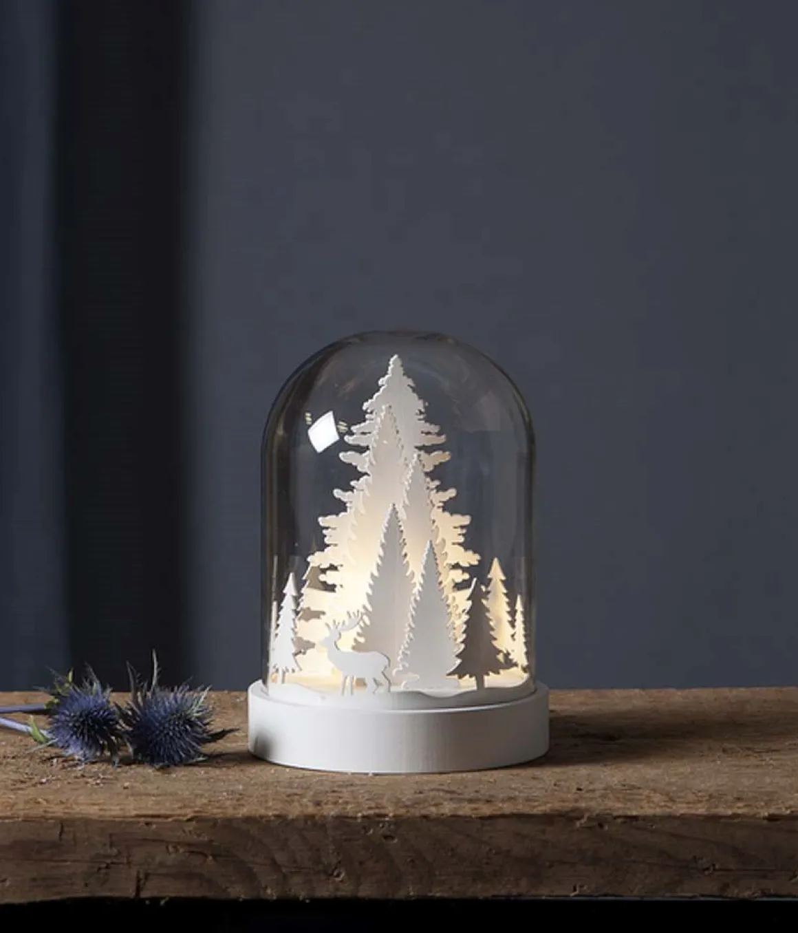 Så vacker liten glaskupol med laserskuren dekoration i trä inuti. Underverket drivs med batteri och är på så sätt lättplacerad i flesta hem. Givetvis med inbyggd timer! Vi bara älskar denna lilla nyhet!