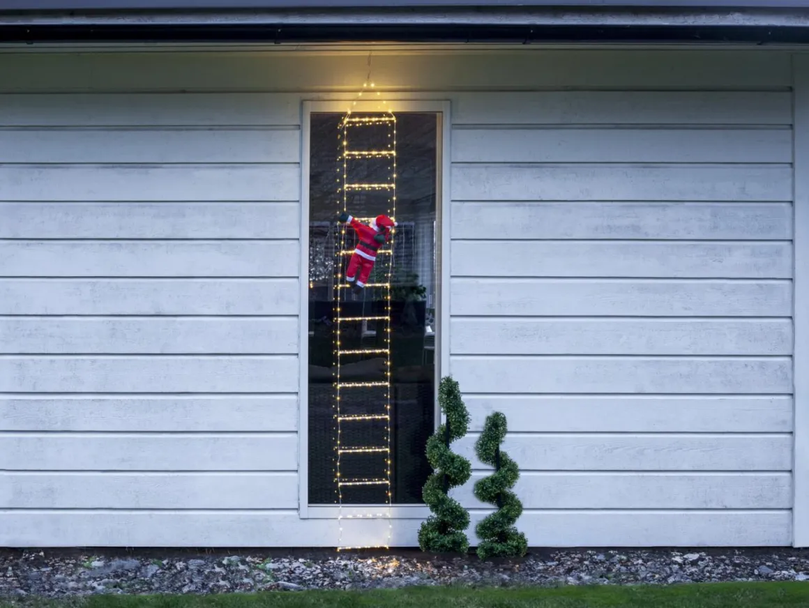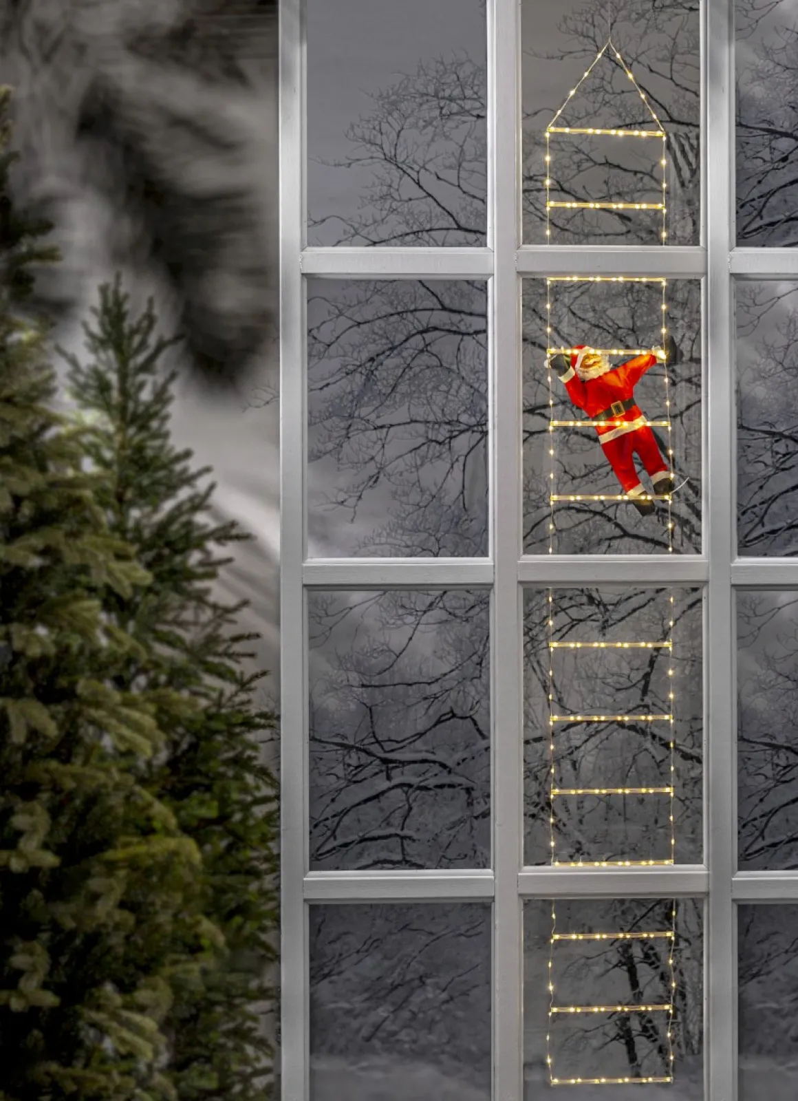 Rolig juldekoration från Star Trading utformad som en stege med en klättrande tomte i polyester. 2 meter hög med chaserfunktion i transformatorn, välj mellan olika blinkfunktioner eller fast sken. 228 st varmvita LED. Lys upp trädgården med denna roliga dekoration!