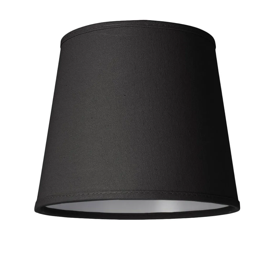 Svart Linne lampskärm från Cottex med en höjd på 17 cm bredd uppe 15 cm, bredd nere 20 cm med svängbart ringfäste för både E27 och E14.