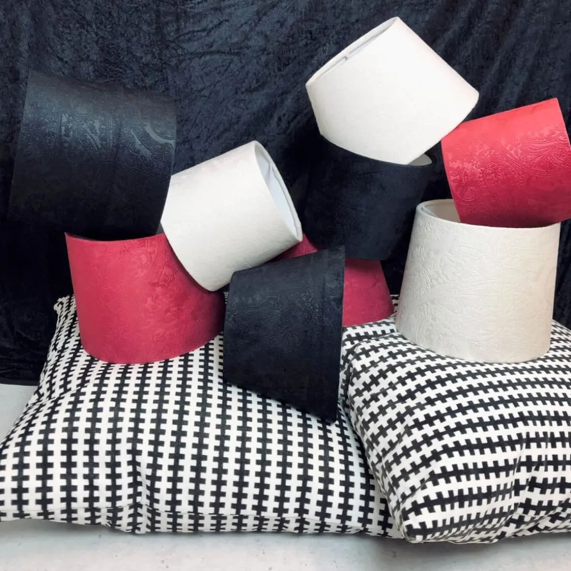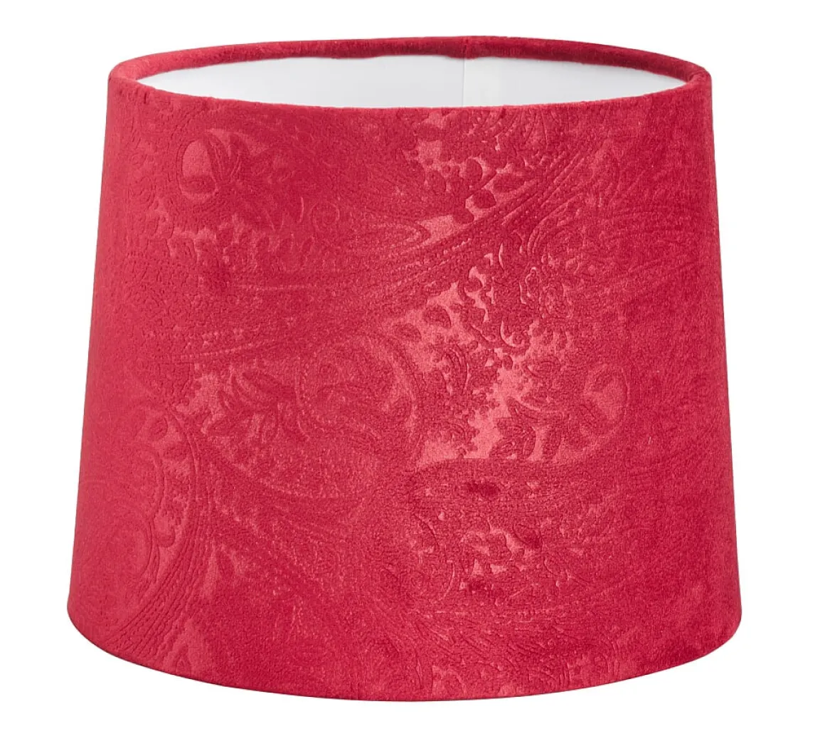 Läcker sammetsskärm från Oriva med ett härligt dovt mönster, skärmen finns i flera storlekar och färger. Här ser du Paisley 20 cm i vinröd.