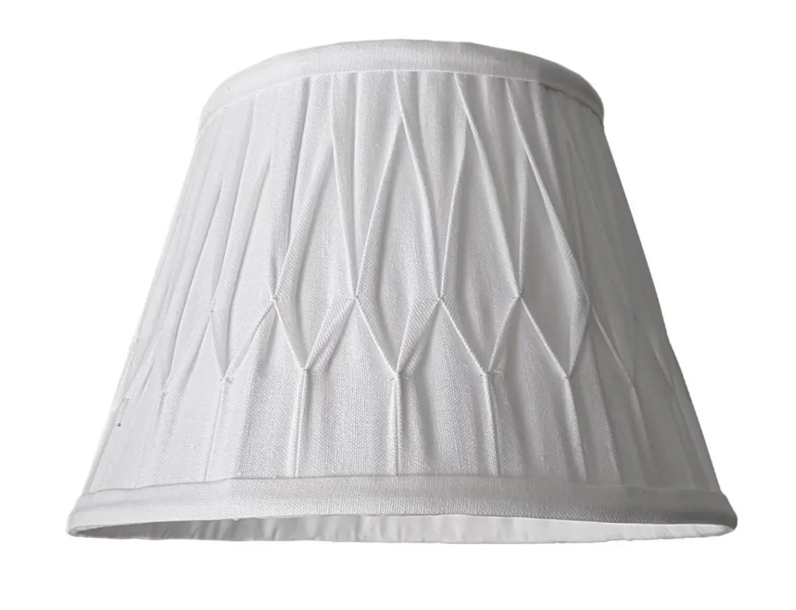 Vit Veckad Linne lampskärm från Cottex med en höjd på 17 cm bredd uppe 16 cm, bredd nere 25 cm med ringfäste för både E27 och E14.