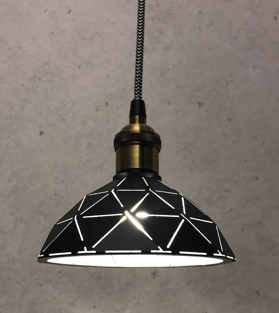 Svart fönsterlampa med vit insida från Oriva i laserskuren tunn metall som bildar ett härligt mönster, levereras med upphäng i antikmässing och textilsladd.