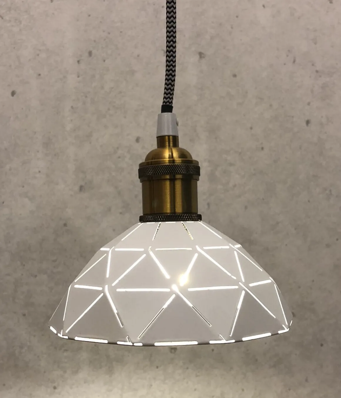Vit fönsterlampa med vit insida från Oriva i laserskuren tunn metall som bildar ett härligt mönster, levereras med upphäng i antikmässing och textilsladd.