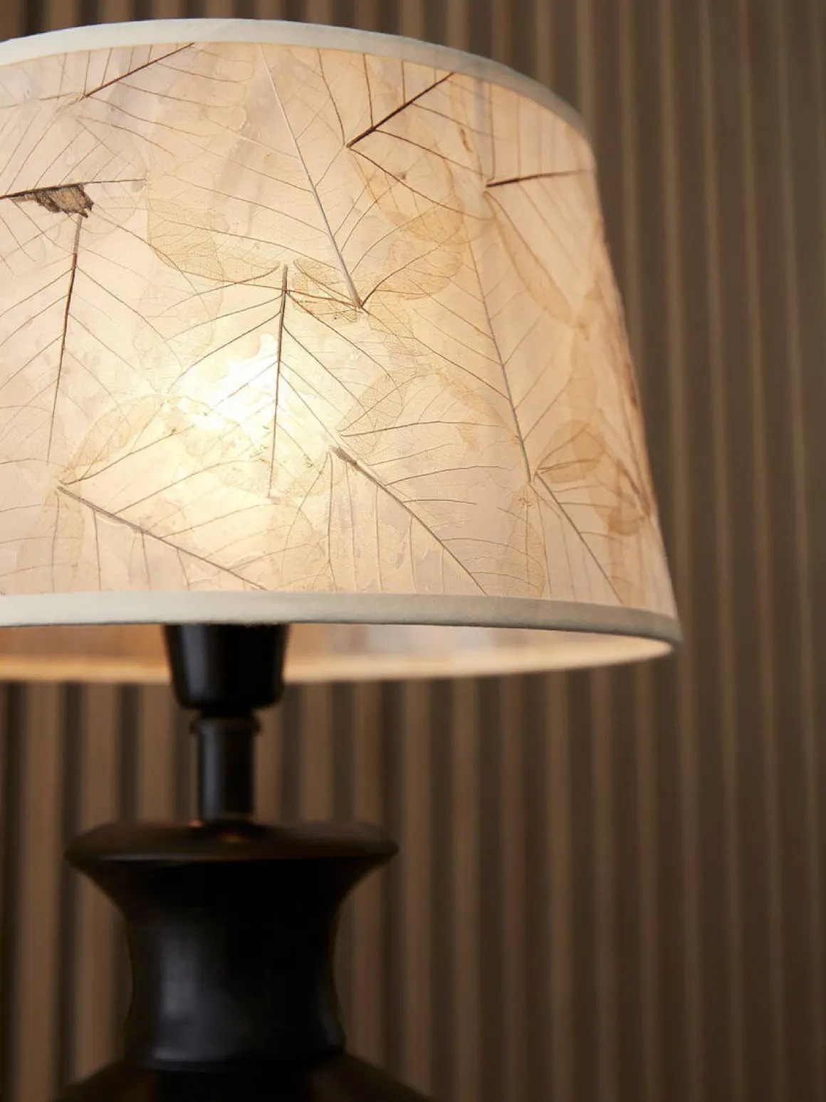 Lampskärm Leaf från PR-Home med torkade pipal löv (ficus religiosa) på ett transparent laminat. En handgjord skärm i naturtoner som ger ett otroligt vackert sken. Skärmen finns i 3 storlekar och är lätt att matcha med olika fötter, gärna en i trä. Här ser du Leaf i storleken 25cm.