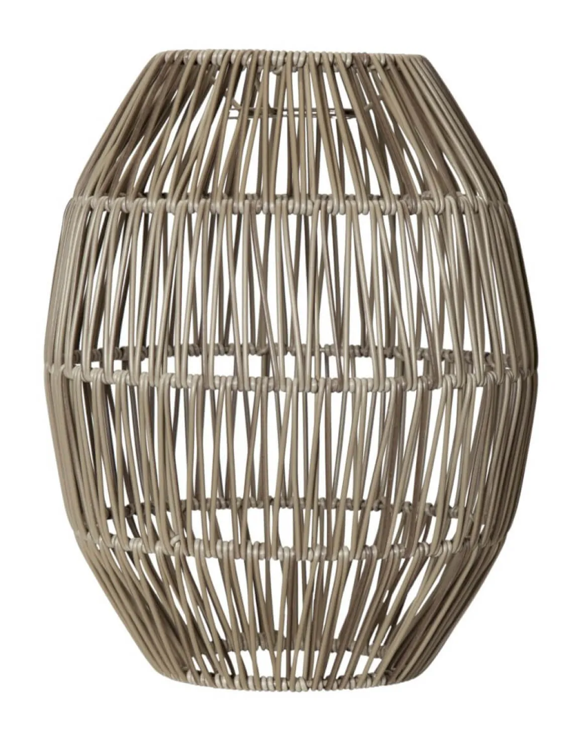 Gråbeige 30 cm hög golvlampskärm i rotting för utomhusbruk. Mixa och matcha med ditt eget val avutomhusupphäng och ljuskälla. Passar lämpligast till E27 sockel.