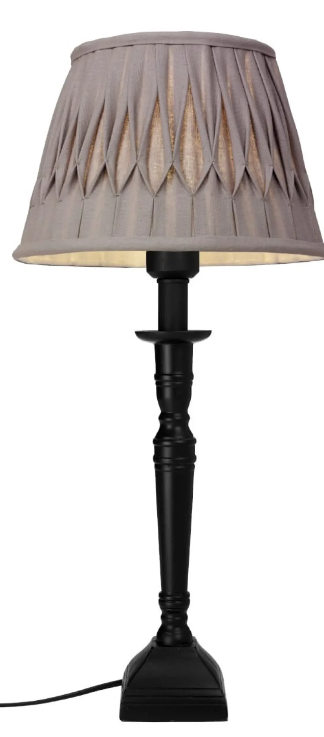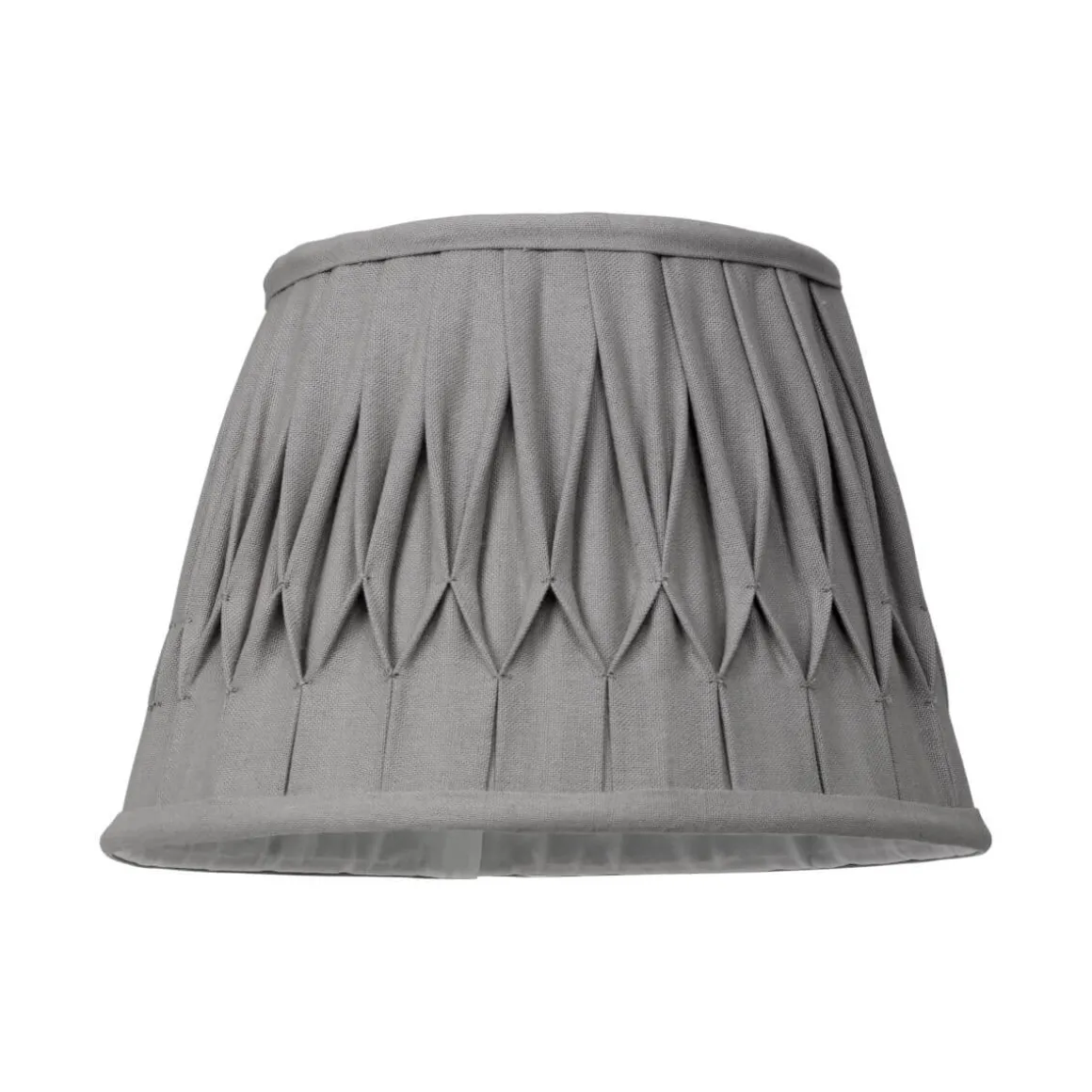 Grå veckad Linne lampskärm från Cottex med en höjd på 17 cm. Skärmen har bredden uppe 16 cm, nere 25 cm och har ringfäste för både E27 och E14.